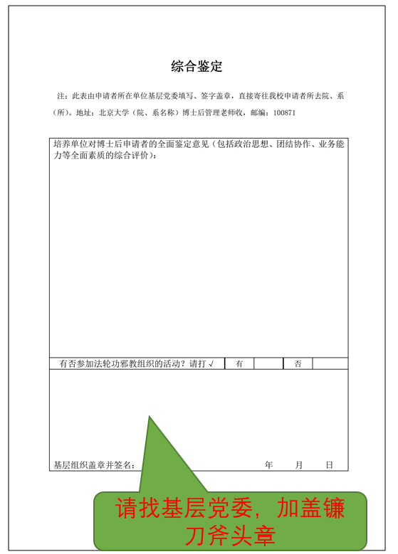 材料10:综合鉴定,国内人员需加盖原所在单位党委(党总支)的公章,一式2份。