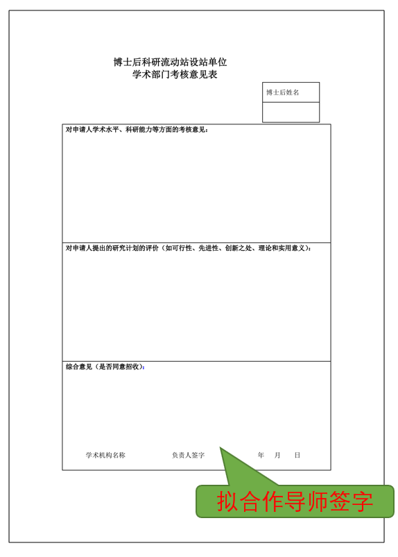 材料11:博士后科研流动站设站单位学术部门考核意见表,一式3份