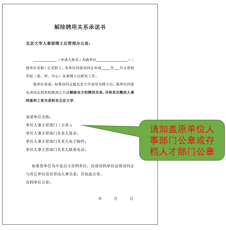 注:入站前有人事单位的,由原单位人事主管部门填写并签章,申请人签字。如已解聘,则直接用解除聘用关系证明代替;统招统分应届生、留学回国无人事关系人员免此项