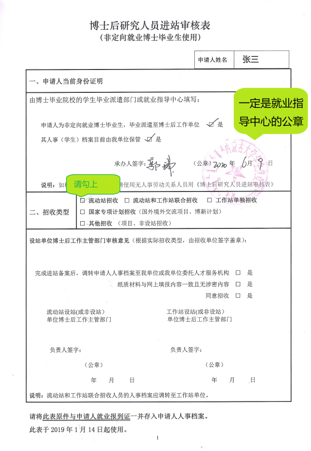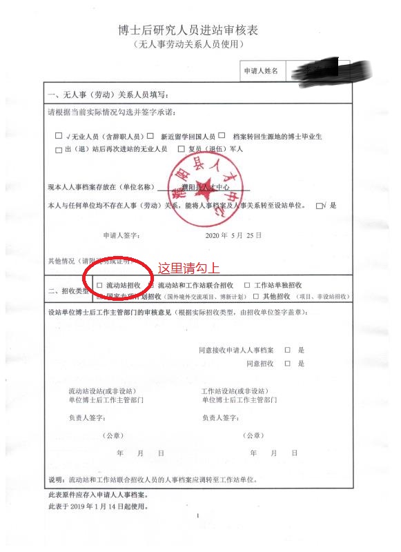 注:请在中国博士后基金会个人提交进站申请界面打印。至少含两份原件。应届毕业生的档案存放于博士毕业单位的,进站审核表中当前身份证明一栏应加盖毕业单位就业派遣部门公章,非所在院系或研究生院公章;如档案已转回生源地,请使用无人事劳动关系人员版的进站审核表。