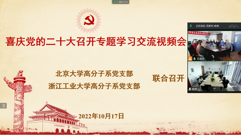 化学学院高分子化学系党支部与浙江工业大学材料学院高分子系党支部于2021年4月签订了“党建共同体”协议,深入开展“党史联学、党务联建、科研联攻、活动联办、榜样联动、品牌联创”等工作。在此框架下,10月17日,两党支部联合召开专题学习交流党的二十大报告视频会。党支部书记范星河、陈思在专题学习会上强调,二十大是进入全面建设社会主义现代化国家新征程的关键时刻召开的一次十分重要的大会,将制定未来五年乃至更长时期的发展目标任务和大政方针,从战略全局上对今后一个时期党和国家事业作出规划和部署。我们要始终坚持用新时代中国特色社会主义思想武装头脑,指导我们的科研、教育、教学工作,兴起学懂弄通做实二十大精神的蓬勃热潮,共同努力推动系各项工作实现高质量发展,力争再上新的台阶。全体党员及全系教师参加学习。