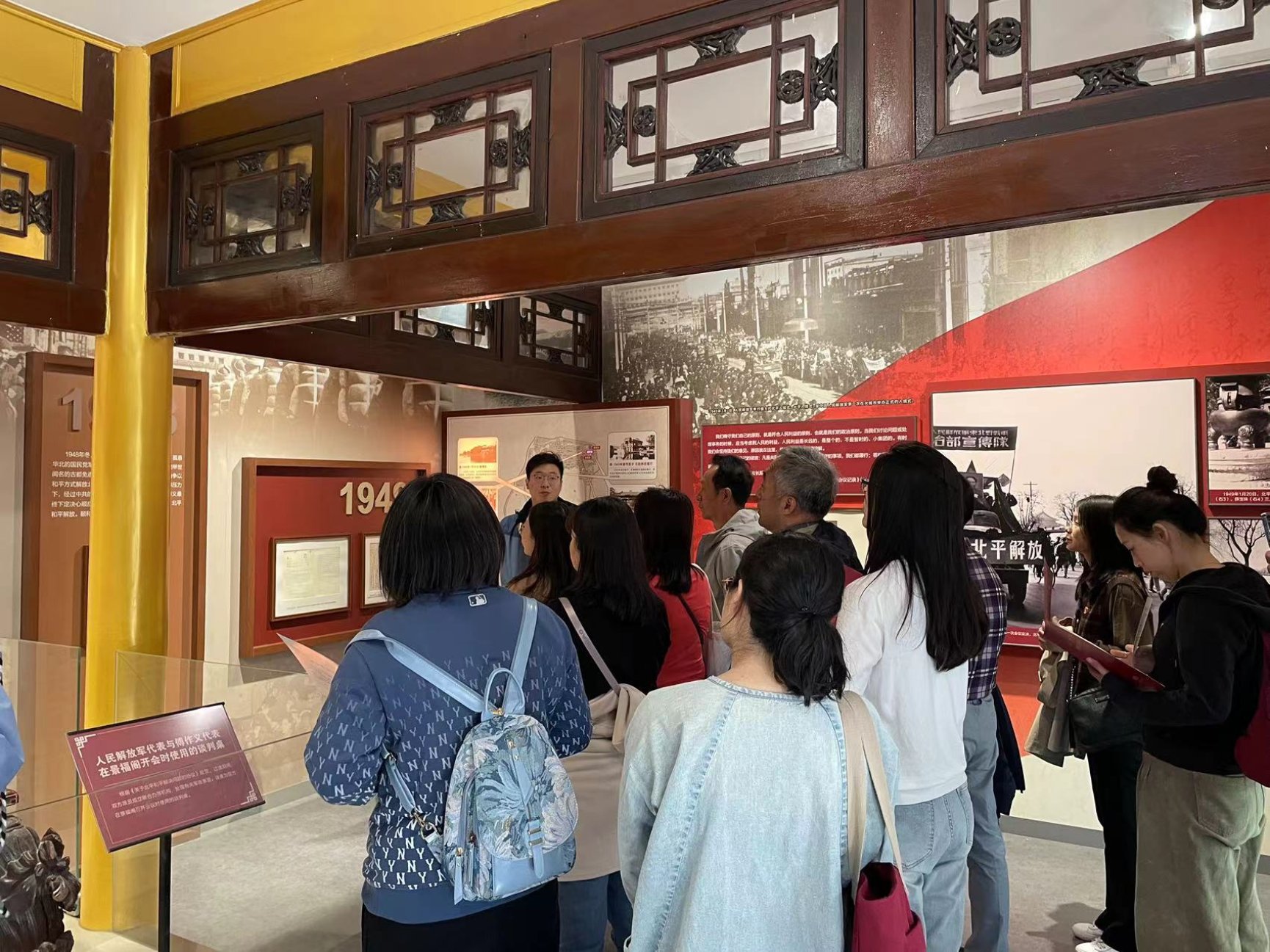 在工作人员的讲解中,大家通过“古园新生”“宴集群贤”“肝胆相照”三个专题展览,全面了解和学习到益寿堂作为中共中央进京“赶考”重要落脚点所肩负的历史重任。1949年3月25日,毛泽东同志等中共中央领导人在此宴请了20位各民主党派负责人和无党派民主人士代表,共商国是大计,从此开始了协商民主的探索之路。