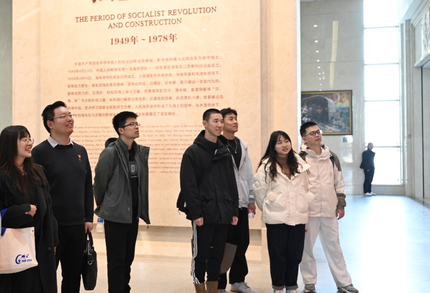 人民海军党缔造,向海图强赴深蓝。军营交流结束后,实践团前往中国人民解放军海军博物馆参观学习。在社会主义革命和建设时期的第一展厅,实践团跟随着一件件文物,探访人民海军从诞生到成长、从薄弱到完备的早期发展历程;在改革开放和社会主义现代化建设的第二展厅,实践团领略了人民海军紧跟党和国家事业发展的历史进程;在中国特色社会主义新时代的第三展厅,实践团见证着人民海军一步步走向深蓝、走向世界一流海军。最后实践团登上鞍山舰观摩学习,切身感悟革命先烈的功勋载体。