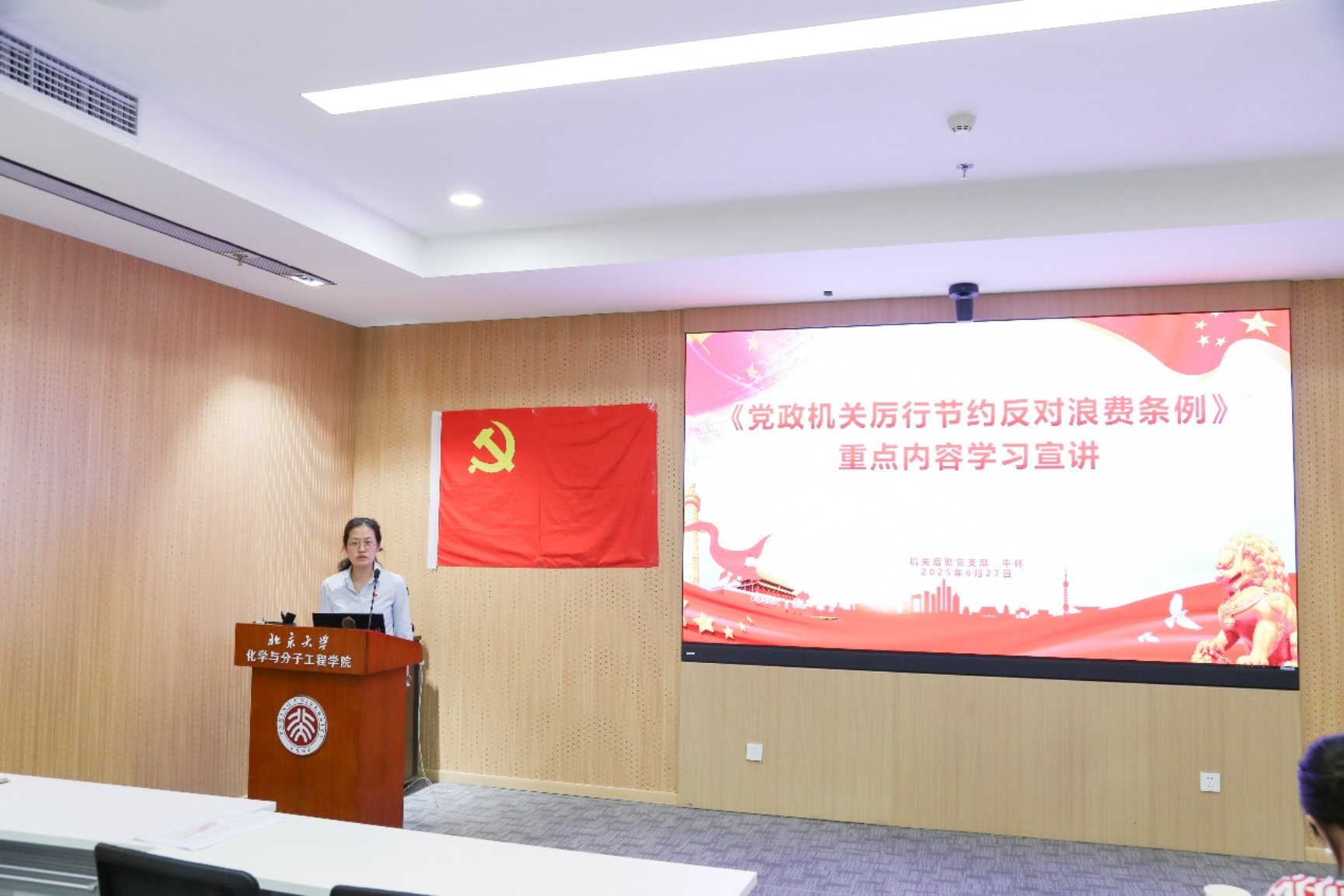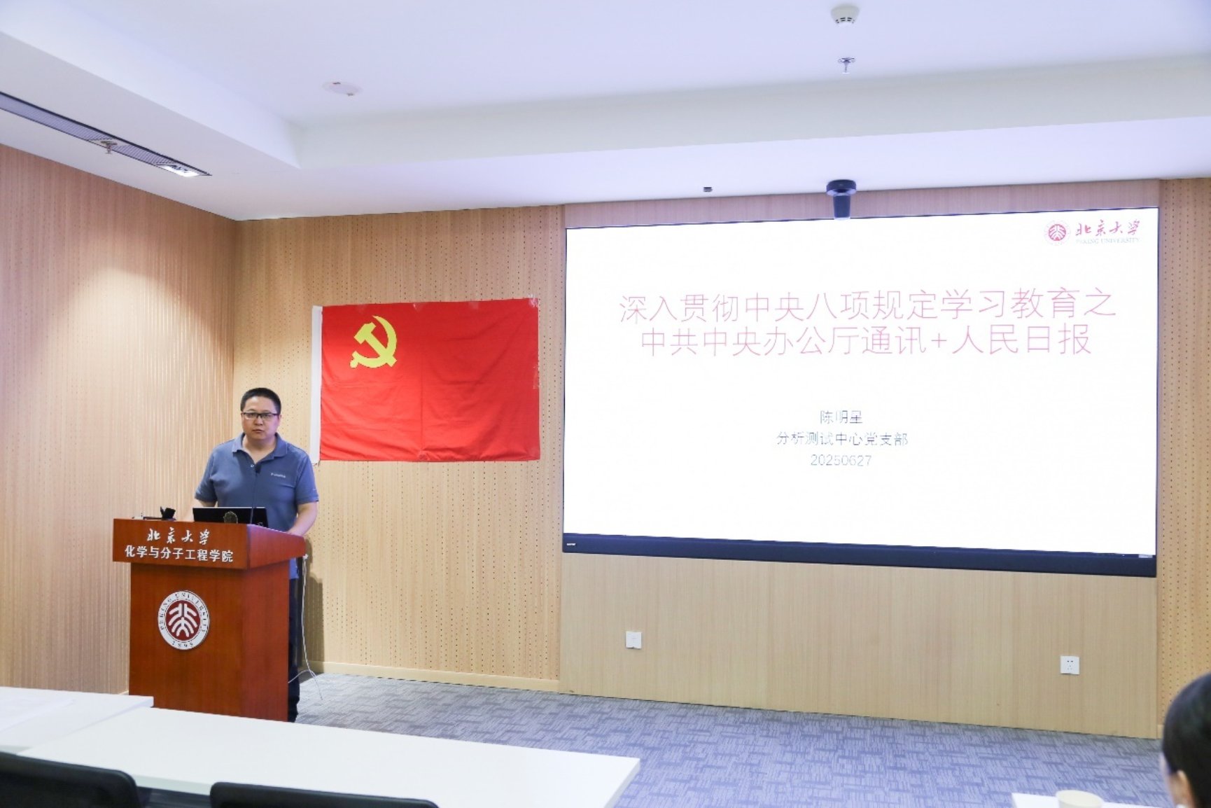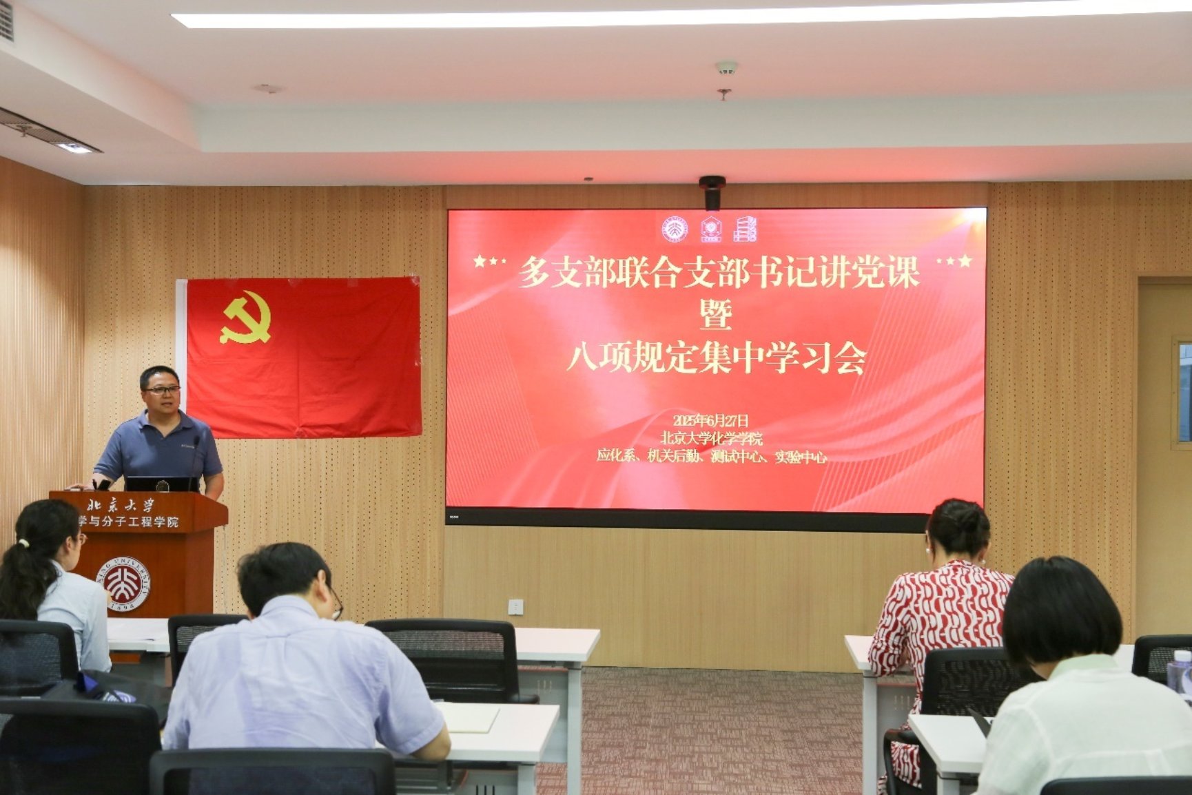 2025年6月27日下午14:00至16:00,应用化学系党支部、测试中心党支部、实验教学中心党支部和机关后勤党支部联合举办的支部书记讲党课暨八项规定集中学习会在化学学院CB213会议室如期举行。此次活动由测试中心党支部支部书记陈明星主持,会议的顺利开展得到了各支部党员的积极参与和高度关注。