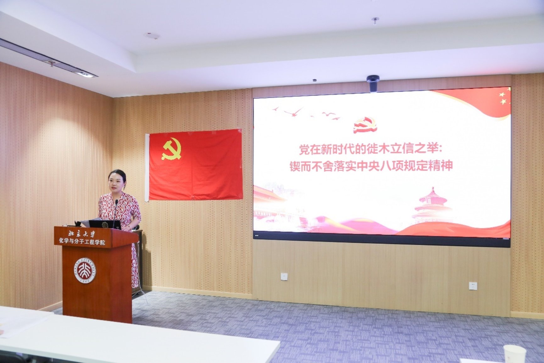 在本次会议中,首先进行的是党课环节。化学学院党委副书记邓安琪为大家作了题为《党在新时代的徒木立信之举:锲而不舍落实中央八项规定精神》的讲解。邓老师深入浅出地讲述了中央八项规定的由来、内容、内涵与意义,分析了八项规定对于党风廉政建设的重要作用,并强调在新时代的背景下,我们每一位党员都应当坚定信念,认真贯彻执行八项规定,提升党内政治生态。通过邓老师的讲解,全体党员对中央八项规定有了更加深刻的认识和理解。