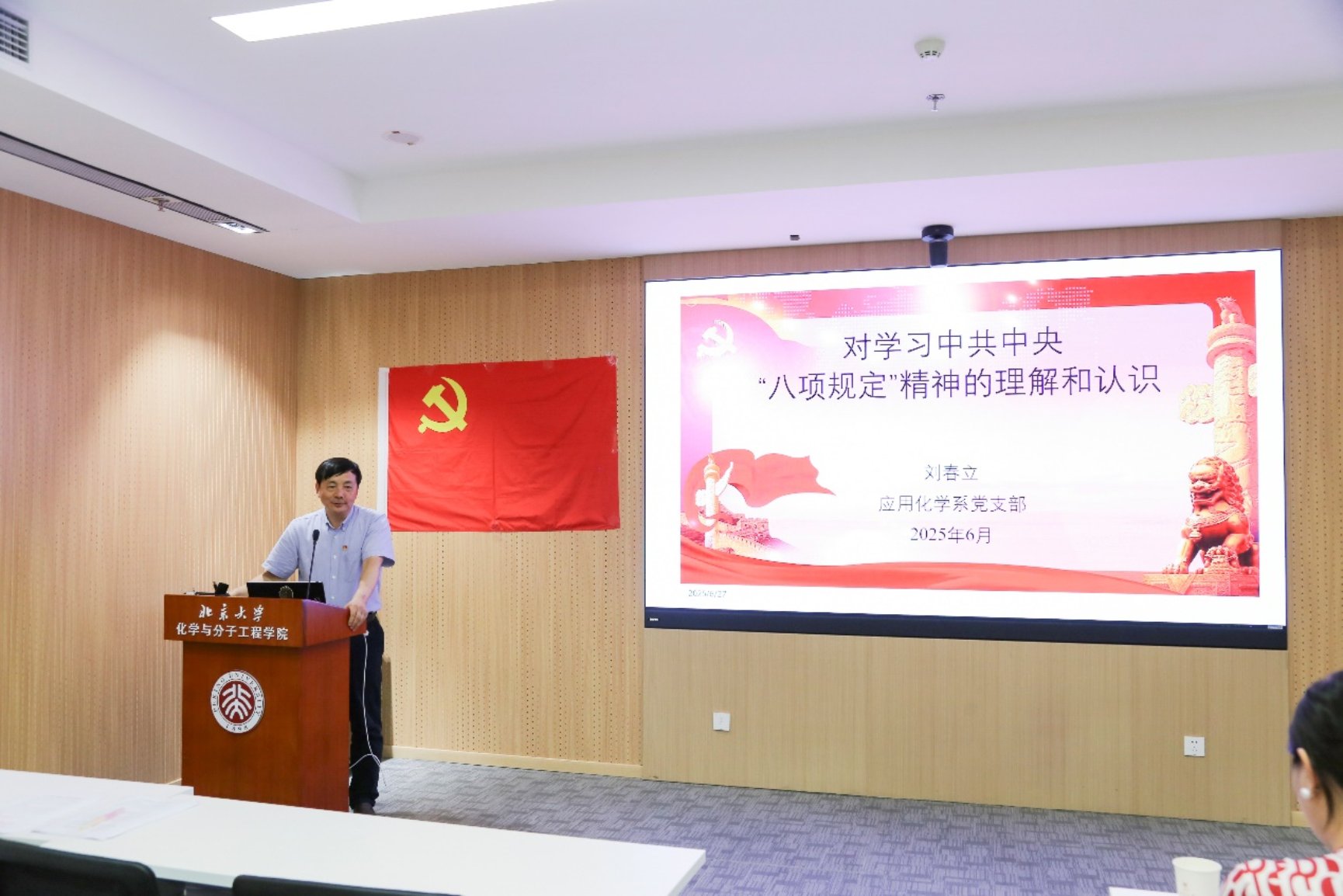 紧接着,应化系党支部书记刘春立以《对学习中共中央“八项规定”精神的理解和认识》为题,从个人学习和实际工作出发,分享了他对八项规定精神的思考与感悟。刘老师强调,中央八项规定不仅是党风廉政建设的重要基础,也是每位党员自我修养和约束的重要标尺。通过对八项规定的学习,党员们能够在日常工作中时刻提醒自己保持清正廉洁的作风。