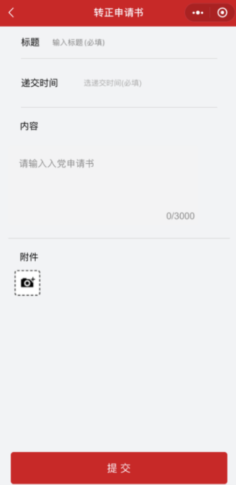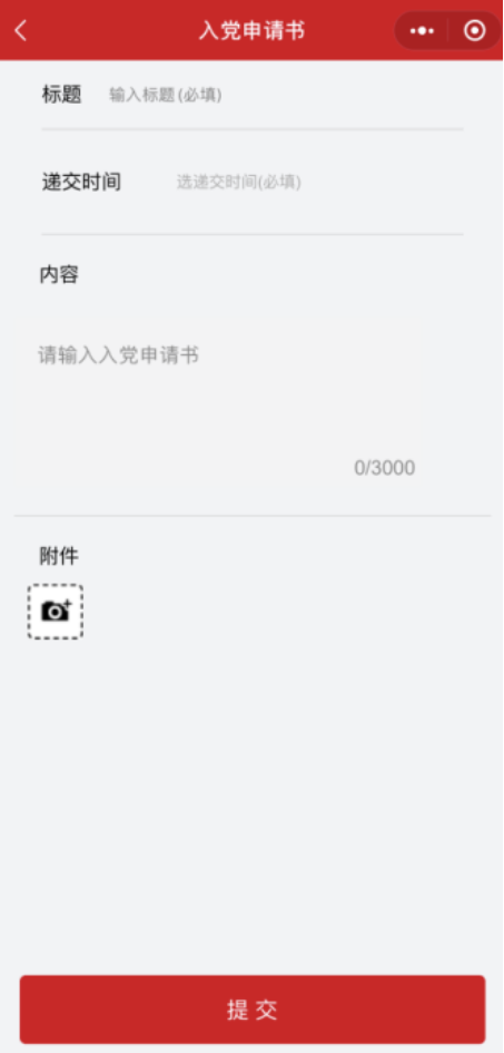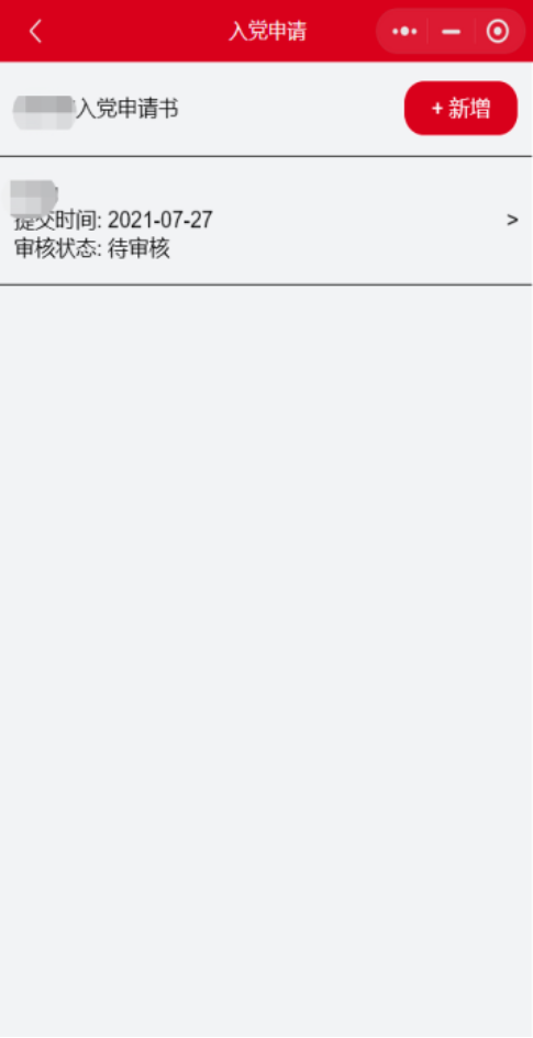 2.在党员发展页面,点击“入党申请书”,进入“入党申请书提交列表页面”,点击“新增”,进入“入党申请书详情页”,填写相关内容,上传附件后提交,等待支部管理员审批。对于已提交的入党申请书,通过向左滑动,还可进行删除。
