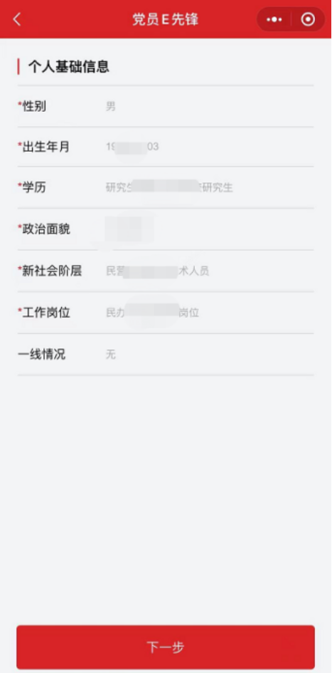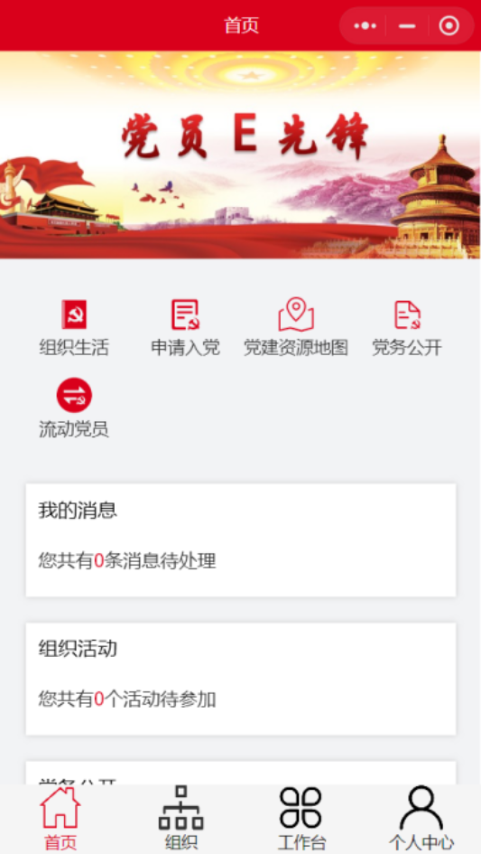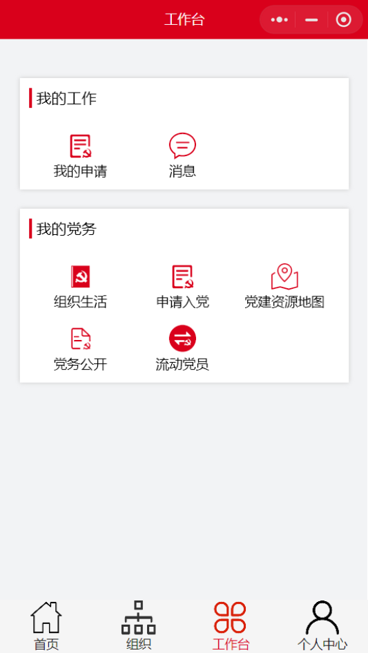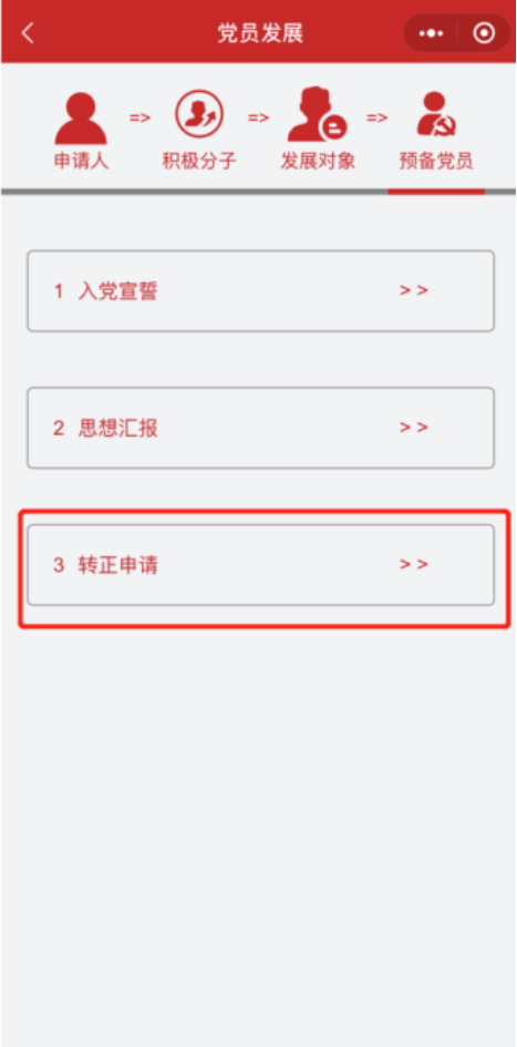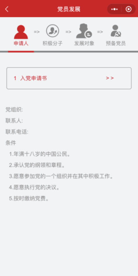 1.在首页中直接点击“申请入党”按钮,或在工作台-我的党务-中点击“申请入党”按钮,进入“党员发展”页面。