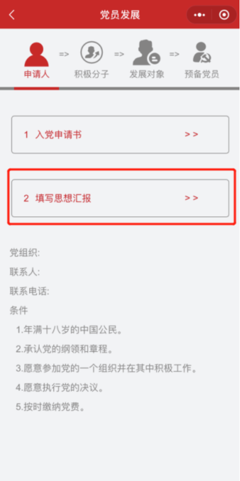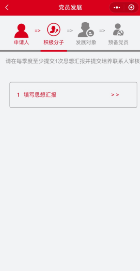1.在“党员发展”页面,点击“填写思想汇报”,然后点击“新增”即可添加。同积极分子阶段。