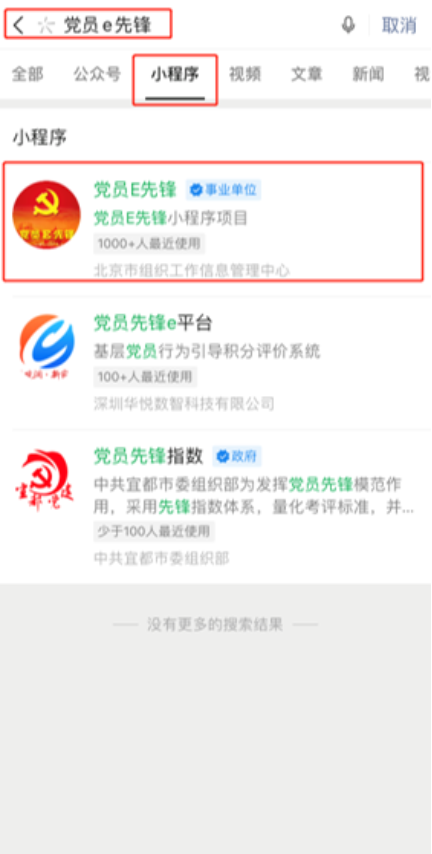 1.在微信小程序中,搜索“党员E先锋”。根据搜索结果,点击“党员E先锋”,登录进入微信小程序。
