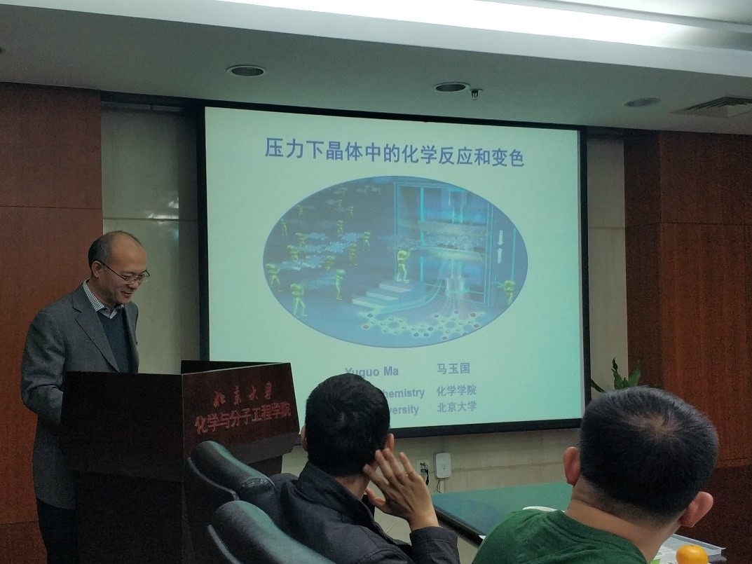 马老师的报告分两部分。他首先介绍了课题组的科研工作,在压力诱导下有机分子表现出丰富的可控聚合,展现了精准分子设计所带来的化学之美。他特别强调在新材料合成过程中,先进的仪器分析手段对确定晶体结构,检定生成物种类并跟踪反应进程起到了重要作用。