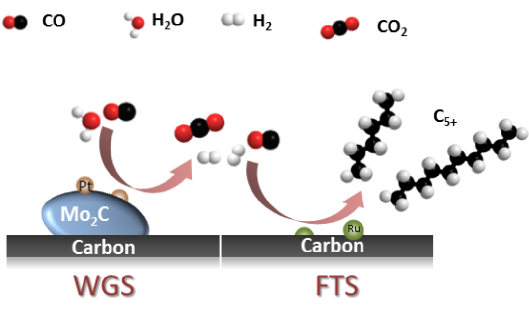 马丁课题组首次实现将水汽迁移反应与费托合成反应成功耦合,构建了水汽迁移反应活性中心Pt-Mo2C/C和费托合成反应活性中心Ru/C。将两种催化剂进行简单的物理混合,通过调节两种活性中心的结构和比例调控各自的反应速率。实现了在低温200oC的条件下,将CO和水一步直接转化制备油品的过程。该过程中费托反应的活性高达8.7 mol-CH2- molRu-1 h-1,与在合成气(H2/CO=2)条件下Ru/C催化剂的费托活性相当,且费托产物中C5+油相产物的选择性接近70%。对比双金属催化剂RuPt-Mo2C/C和物理混合催化剂的结果,发现两种活性金属Pt和Ru的结合形式在催化反应中起了十分重要的影响。当Pt和Ru形成PtRu合金后会同时削弱WGS和FTS两个反应的的活性,进而打破两个反应之间的动力学平衡。而当两种活性中心分别作用的时候则刚好使两个反应的动力学速率达到平衡,实现最优的CO和水转化制备油品的活性和选择性。该研究成果以“Direct conversion of CO and H2O into liquid fuels under mild conditions”为题发表于Nature Communication(https://www.nature.com/articles/s41467-019-09396-3)。并被Nature Communication Editor选为“Highlights webpage of recent research on Inorganic, Nanoscale and Physical Chemistry” ( https://www.nature.com/collections/wtpqpqpgwd/content/long-chen).