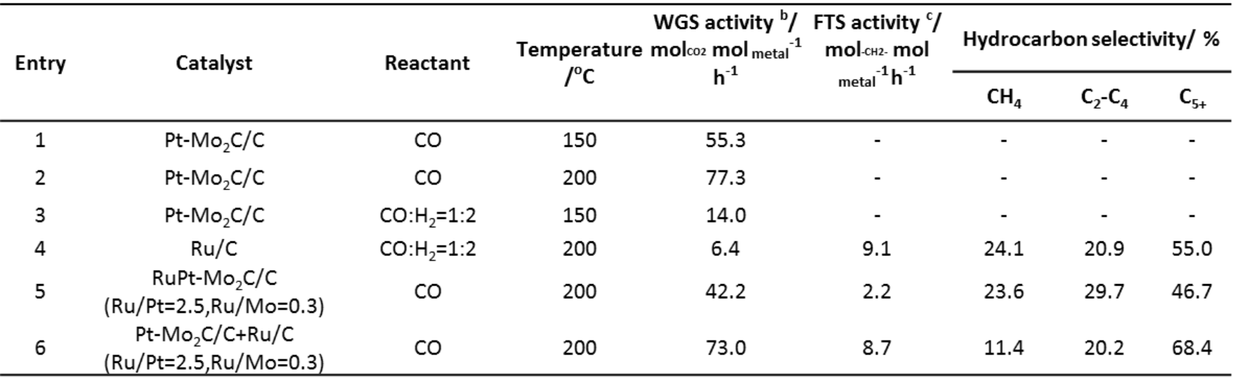 表一. 不同催化剂在CO和合成气气氛下的催化性能