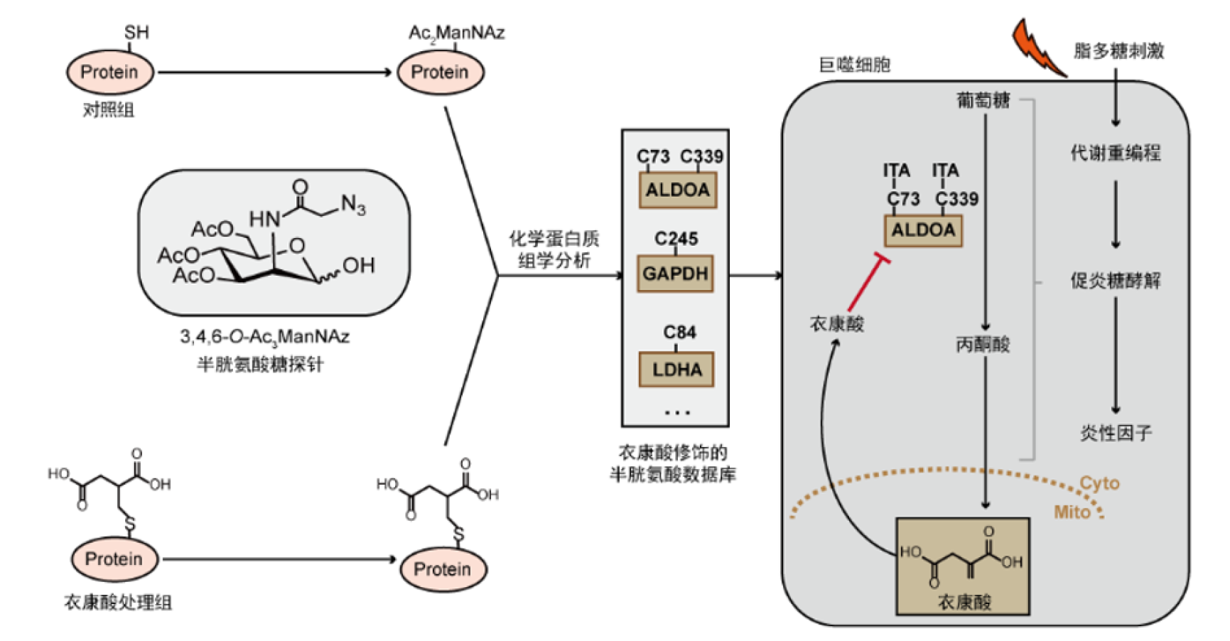 小分子代谢物和蛋白的相互作用在各种生物学过程中都发挥着至关重要的作用,发展化学蛋白质组学技术系统分析蛋白-代谢物相互作用网络可以促进对其生物学意义的理解。衣康酸是近年来在巨噬细胞中发现的一类具有显著抗炎活性的代谢小分子, 但其抗炎机制尚不明确。由于衣康酸具有一个α,β不饱和羧酸的结构,理论上它可以通过迈克尔加成反应共价修饰到蛋白质的半胱氨酸残基上。此前,两个课题组合作发现,用于非天然糖代谢标记的全乙酰化叠氮糖探针,在细胞中可以通过无酶催化形式标记蛋白质组中大量的半胱氨酸位点(Qin W., et al. Angew. Chem. Int. Ed. 2018.)。基于该反应,两个课题组在本工作中合作开发了新一代特异性半胱氨酸标记糖探针1-OH-Az,并结合定量化学蛋白质组学技术,成功地在巨噬细胞蛋白质组中鉴定到260个衣康酸修饰的半胱氨酸位点。作者进一步分析发现糖酵解中的三个关键酶ALODA,GAPDH和LDHA都可以被衣康酸修饰,其中最上游的ALDOA蛋白中两个半胱氨酸(Cys73和Cys339)上在被脂多糖刺激的巨噬细胞中发生了内源的衣康酸修饰。生化和细胞实验表明衣康酸可以通过修饰这两个半胱氨酸残基显著地抑制ALDOA的催化活性,进而抑制巨噬细胞内的糖酵解通路,从而发挥抗炎活性。