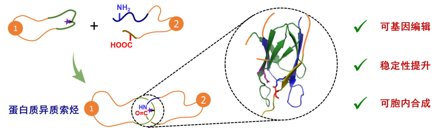 拓扑在数学上指图形在连续形变中所保持不变的空间性质,在化学领域则被用来描述分子在不断裂化学键的前提下保有的原子间和链段间的连接关系和空间关系。在高分子中,拓扑结构常常是调控高分子物理性能与功能的重要参数。在生命体系中,由于受到其生物合成机制的限制,新生蛋白质的主链拓扑结构均为线性结构。然而,从自然界中存在的少数非线性拓扑蛋白质(如套索蛋白、打结蛋白以及索烃蛋白等)的例子中,人们发现拓扑结构可赋予蛋白质额外的稳定性和生物功能,因此拓扑调控可成为蛋白质工程的一种新的策略。目前,人工设计的拓扑蛋白质结构仍然较少,其合成方法单一,亟需发展新的合成方法,以适应更多样、更复杂的拓扑结构的制备。