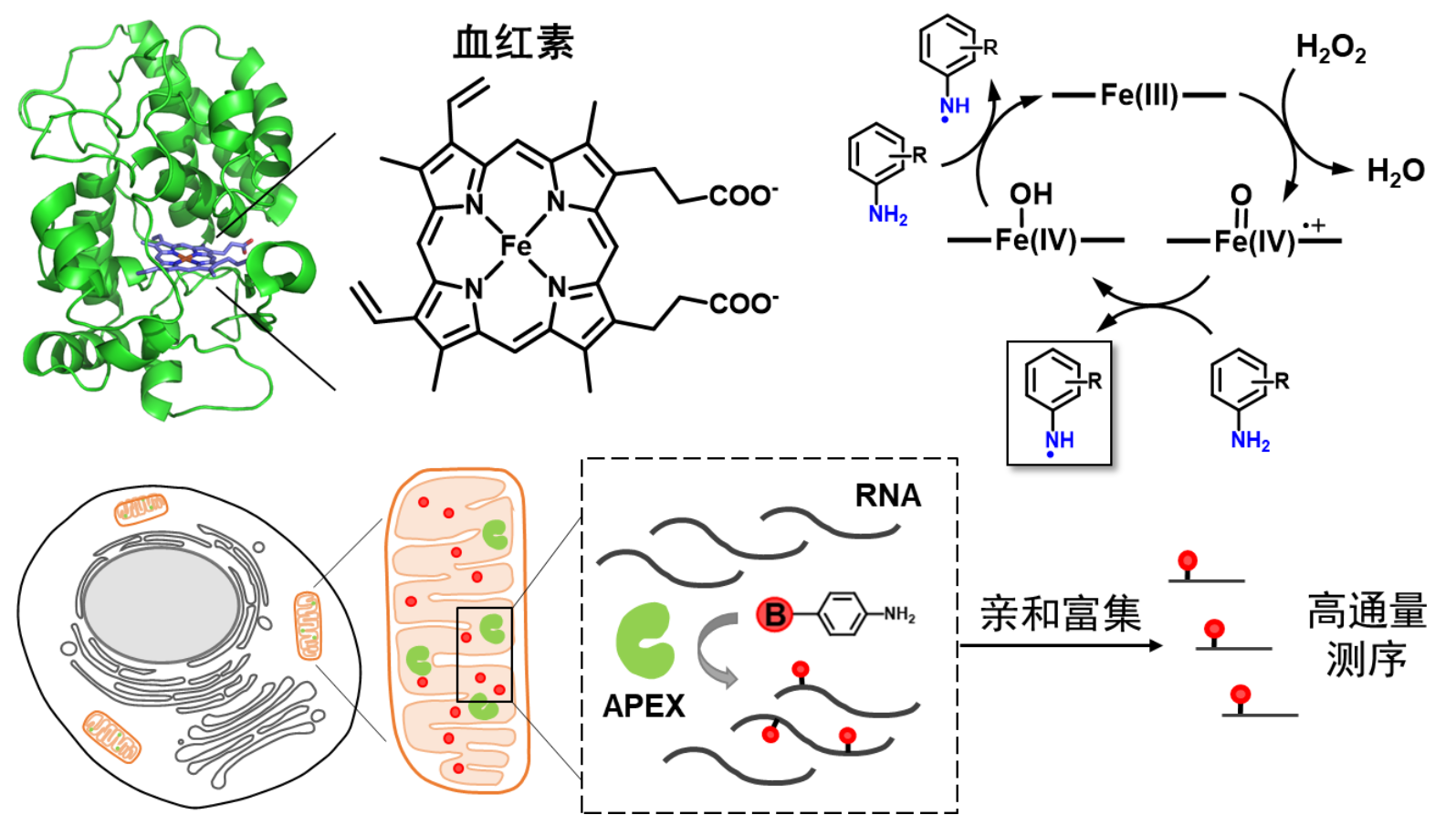 针对这一难题,邹鹏课题组提出“邻近核酸标记”的策略。该策略的核心是在活细胞中利用酶促反应形成大量高活性的自由基,与酶邻近的核酸分子发生共价加成反应,从而实现空间特异性标记。从工程改造的过氧化物酶APEX2出发,邹鹏课题组首先设计并合成了十余种与生物素偶联的酶底物,并从中发现生物素-苯胺探针的核酸标记活性最高。他们进一步以线粒体、核纤层和核仁等亚细胞结构为例,建立了在活细胞中开展邻近核酸标记的方法,并通过定量PCR与高通量测序分析证实了标记方法具有良好的空间特异性。邻近核酸标记技术操作简单、具有普适性,为日后研究核酸的亚细胞定位与功能关系提供了必要的工具。