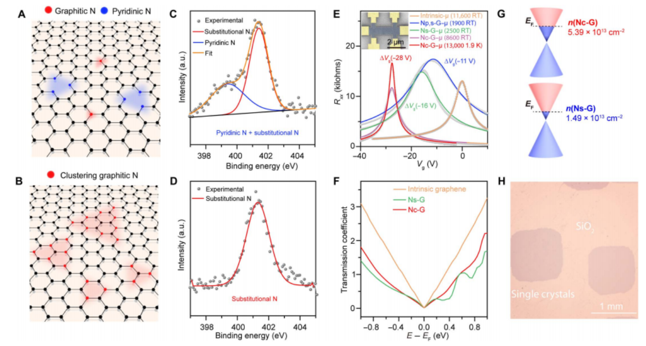 石墨烯的骨架掺杂是指在保持石墨烯六方晶格完整的同时,通过引入杂原子如氮、硼等直接替换sp2杂化的二维晶格骨架中碳原子。石墨烯骨架被杂原子掺杂后,载流子浓度增加,并且骨架掺杂的形式有助于降低散射,维持石墨烯较高的载流子迁移率,导电性显著增加;又因为骨架掺杂原子在化学反应中可以提供更多的活性位点,因此,骨架掺杂的石墨烯在催化、能源等领域得到了广泛关注。然而,稳定且可控的骨架掺杂仍是目前石墨烯化学气相沉积(CVD)生长的难点,掺杂后的石墨烯稳定性较差,迁移率较低,通常在10 cm2/Vs量级。因此,如何实现高效的骨架掺杂仍是石墨烯领域的研究瓶颈。最近,刘忠范课题组和彭海琳课题在国际著名刊物Science Advances上发表题为Nitrogen cluster doping for high-mobility/conductivity graphene films with millimeter-sized domains (Science Advances 2019, 5, eaaw8337)的文章,利用氧气对非骨架掺杂选择性刻蚀的效应,首次在Cu衬底上实现了石墨烯的完美骨架掺杂生长,氮掺杂后的石墨烯迁移率高达13000 cm2/Vs,比其他工艺制备的掺杂石墨烯要高出数个量级。同时,石墨烯的面电阻也降低到130 oh/sq,掺杂的稳定性显著提高。