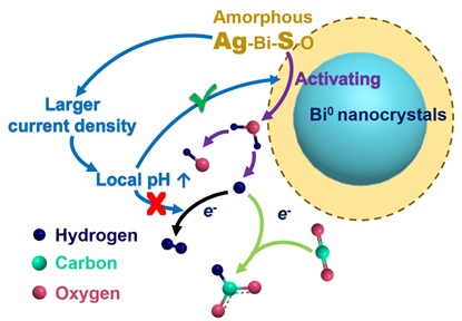 图1:Ag-Bi-S-O修饰Bi0纳米颗粒在低过电位下高效催化二氧化碳电还原合成甲酸的原理示意图。