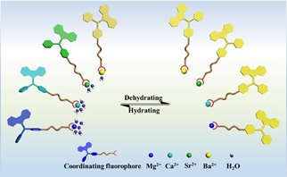 图1: 不同水化能力不同的碱土金属离子与配位发光两亲分子配位引起的发光颜色变及其失水后荧光颜色示意图。