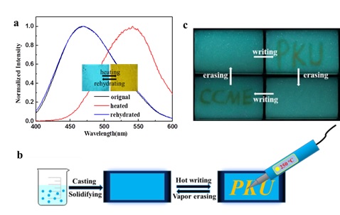 图4. 基于PBFL-Mg体系的可逆热擦写材料。a) 加热引起PBFL-Mg体系的荧光发射由蓝变黄,溶剂熏蒸使荧光恢复;插图为对应的蓝色及黄色荧光样品照片。 b) 热擦写材料构筑示意图;c) 用热写笔在蓝色基底上可逆书写的实验结果。
