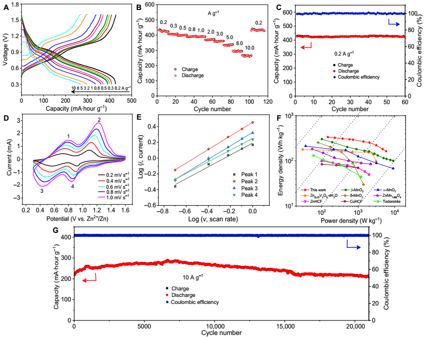 近期,他们通过设计一个新的多级多孔锌钒氧化物结构(图1)来解决层状的钒氧化物正极材料在充放电过程中遭受Zn2+嵌入/脱出产生的应力引起晶格膨胀/收缩导致的结构变形,电池循环稳定性差的问题。这种Zn0.3V2O5•1.5H2O正极在0.2 A g-1下,具有高的比容量为426 mA h g-1,表现出前所未有的超长循环稳定性,在10 A g-1下,20,000次循环后,容量保持96%(图2)。其电化学机理如下:锌离子插入引起晶格收缩,水合氢离子插入引起晶格膨胀,相互抵消,在充放电过程中,晶格保持不变,有利于循环稳定性。多级多孔结构提供了正极材料与电解液丰富的接触,缩短离子扩散路径,缓解了在电化学过程中产生的应力提供缓冲,有利于快速动力学和长期稳定性。发展的电化学方法制备的三维钒氧化物具有能量密度高、倍率性能好、循环稳定、易于制备等特点,推动了水系锌离子电池的发展。