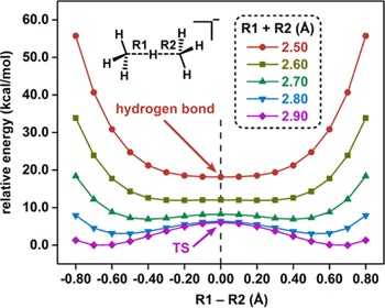 最近,余志祥教授和研究助理王熠博士通过理论计算首次提出了对称C···H···C氢键存在的可能性。作者首先以甲烷与甲基负离子所形成的氢键复合物为例论证了对称C···H···C氢键存在的理论基础。如图2所示,当两个碳原子之间的距离被固定为2.90 Å时,体系展现出了双势阱势能面的特征。随着两个碳原子不断靠近,势能面逐渐由双势阱向单势阱过渡。最终,当两个碳原子之间的距离被缩短至2.50 Å时,体系中首次出现了对称的碳氢碳氢键。