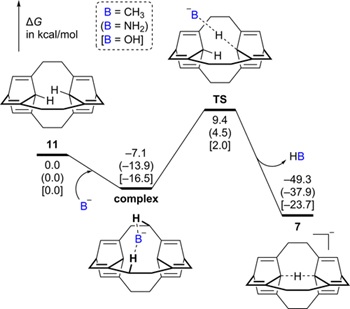 图4. 由烃类前体11转化为碳负离子7的势能面。
