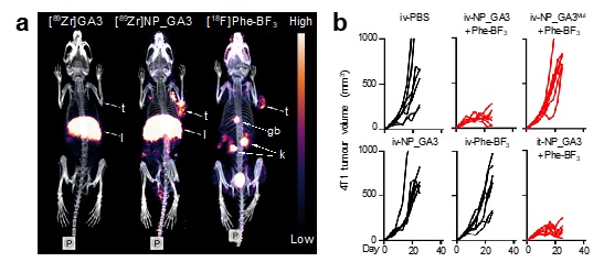 图二 a) PET-CT分子影像在活体内示踪“双靶向”生物正交剪切系统。