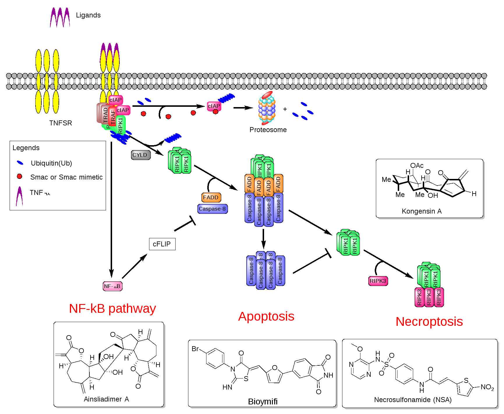 细胞死亡是最重要和普遍存在的生命现象之一。目前我们所认知的细胞死亡的两种主要方式是:细胞坏死(necrosis)和细胞凋亡(apoptosis)。长期以来,细胞坏死被认为是不被调控的,然而近些年研究表明某些细胞坏死也是一种程序性的细胞死亡,受到基因严格调控。细胞坏死参与很多重要的生理过程中,并与许多人类疾病的发生密切相关,如:肿瘤、急性胰腺炎、缺血性心脑管疾病、以及神经退行性疾病等。因此,深入研究细胞坏死的分子机制和与之相关疾病的治疗方法具有重要的科学意义和社会意义。然而,由于许多和细胞死亡相关的调控基因都存在“致命性”,而且相关信号转导通路非常复杂,目前经典生物学研究方法遇到了很大瓶颈。因此,开发出通过运用小分子探针,且具有高效、可视、可控、和定量化的化学方法来研究细胞死亡的生物作用机制和调控方法具有重要意义。