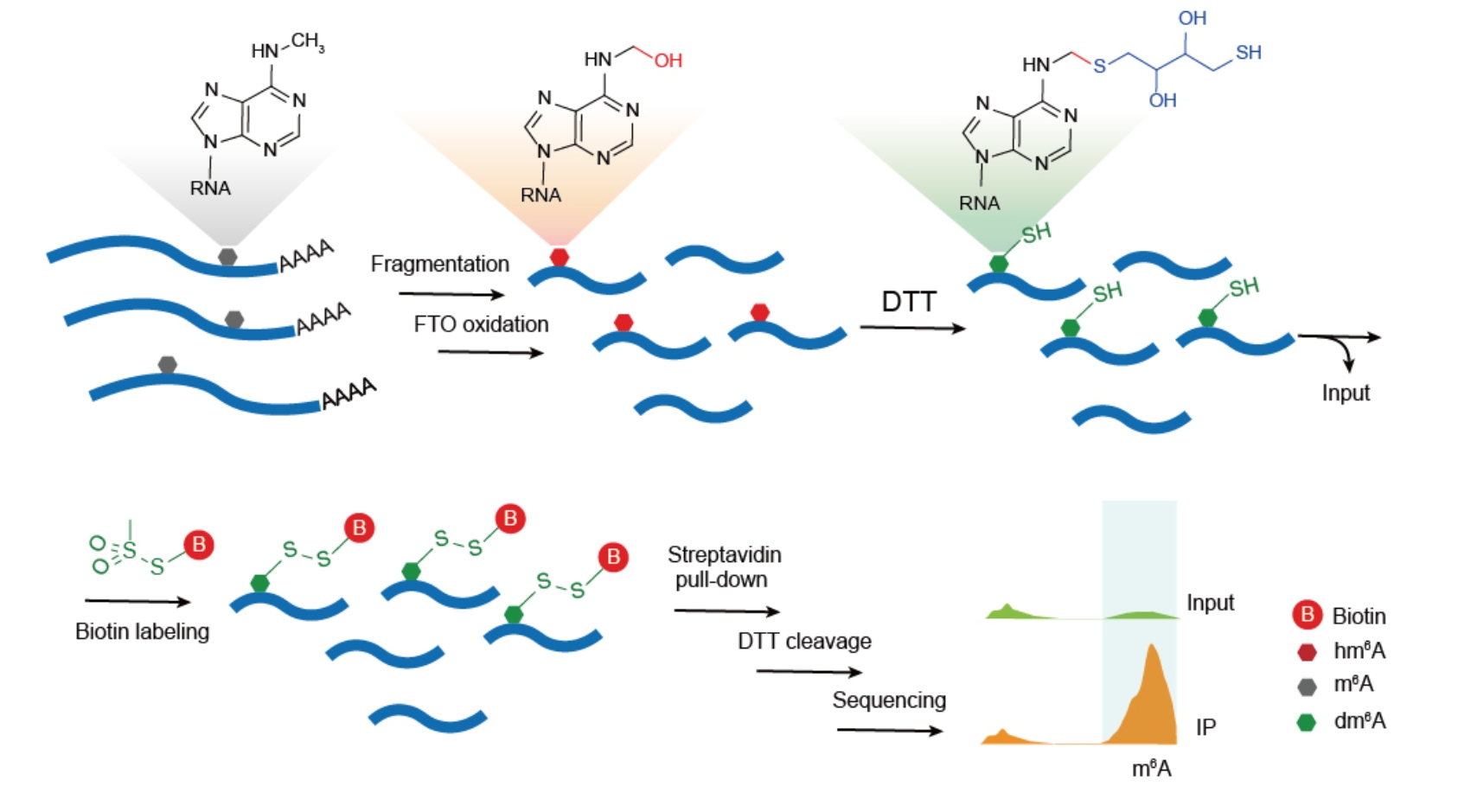 贾桂芳课题组一直致力于开发和利用核酸化学生物学技术研究RNA化学修饰在动植物中的生物功能研究。在本课题中,贾桂芳课题组巧妙地利用m6A的去甲基酶FTO蛋白作为催化剂,将mRNA上化学惰性的m6A转化为高反应活性的中间态产物N6-羟甲基腺嘌呤(hm6A),然后利用二硫苏糖醇(DTT)的巯基与hm6A发生亚胺1,2加成反应,将不稳定的hm6A转化为更稳定的巯基加成产物dm6A。dm6A上的自由巯基可以与甲烷硫代磺酸(methanethiosulfonate,MTSEA)快速反应,实现在mRNA上m6A的位置标记生物素Biotin,最终可被链霉亲和素珠捕获,从而富集含有m6A修饰的RNA片段供后续高通量测序使用。此方法被命名为m6A-SEAL(FTO-assisted m6A selective chemical labeling method)(见图一)。