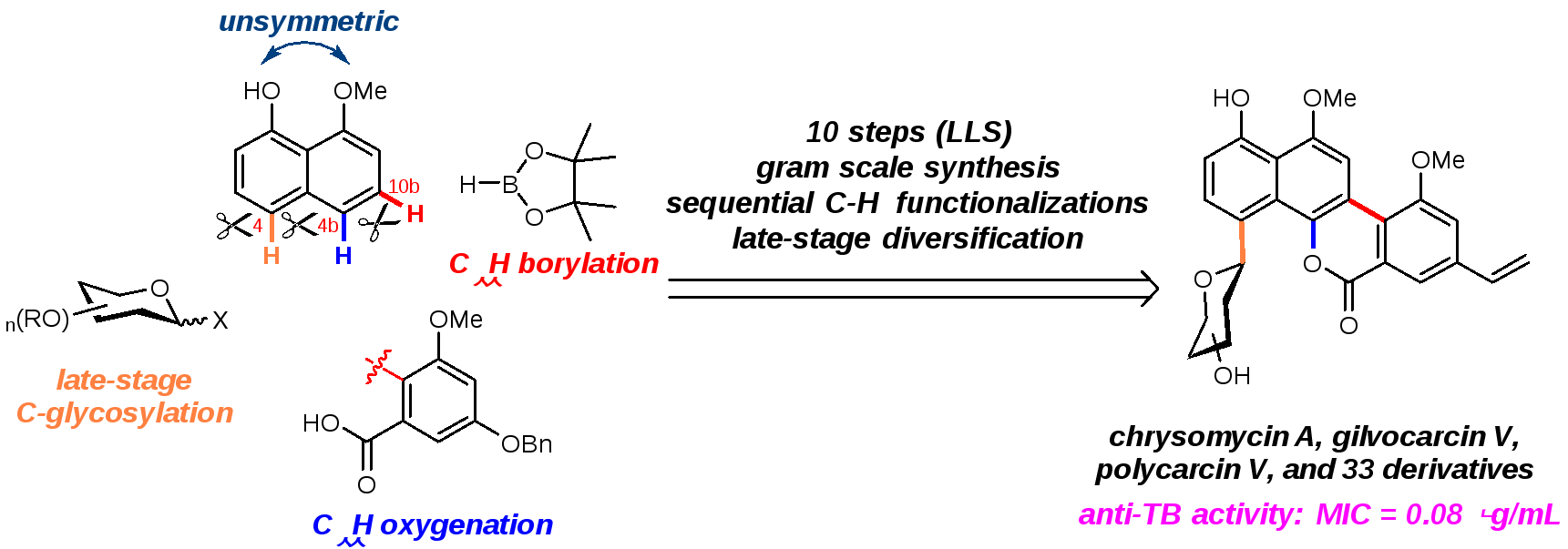 在第一篇以“Chrysomycin A Derivatives for the Treatment of Multidrug Resistant Tuberculosis”为标题的研究论文中(DOI:10.1021/acscentsci.0c00122),雷晓光课题组首先利用有效的“连续碳-氢键活化策略”(sequential C-H functionalizations)实现了一类结构新颖、独特的碳-芳基糖苷类天然产物chrysomycin A、polycarcin V和gilvocarcin V的高效全合成(图一)。整个合成路线简洁、高效,只利用了10步化学转化就实现了三个复杂天然产物分子的“克级”全合成,比起之前其他课题组所报道的合成路线(18-30步),在合成效率上有了非常大的提高。