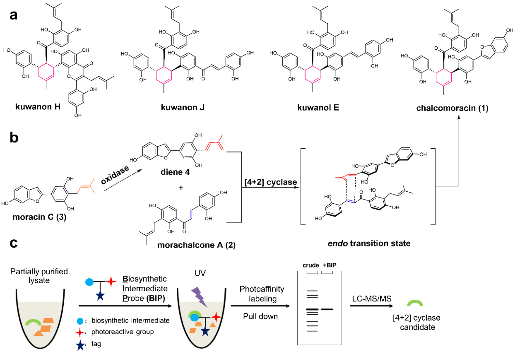 植物天然产物作为内源性小分子参与了自身重要生理活动,例如调控植物自身的生长发育以及抵御病虫害, 同时也是治疗人类重大疾病的创新药物分子的主要来源。因此,解析植物天然产物的生物合成途径对于植物生物学、生态学研究、以及开发创新药物治疗人类重大疾病都具有重要意义。然而由于植物自身的特点(生长缓慢,基因组庞大)以及参与生物合成的基因往往不成簇分布的现象,植物天然生物合成研究方法有限,进展缓慢。在本文中,雷晓光课题组开发出一种基于天然生物合成中间体分子探针(Biosynthetic Intermediate Probes, BIPs)的靶标垂钓策略(如图1所示),并与合作者一起通过结合植物天然产物生物合成研究中的常规手段(活性导向蛋白分离以及转录组测序等方法),成功在桑树愈伤组织中鉴定出两个FAD依赖蛋白(MaMO和MaDA),其中MaDA被进一步证明为自然界中存在的首个催化分子间Diels-Alder反应的单功能酶。该基于“天然产物生物合成中间体分子探针”的化学生物学研究策略,为解析植物天然产物生物合成途径提供了新的研究思路。