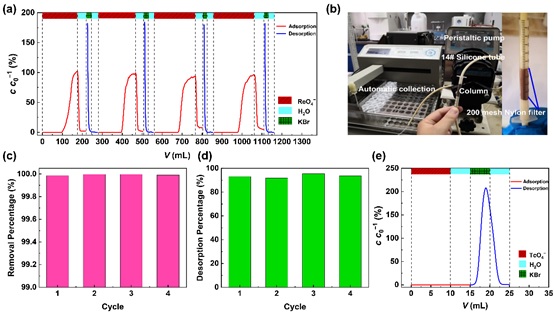 更为重要的是,制备的COFs材料所具有的高孔隙率和超稳定的纳米纤维状结构,使其成为ReO4−/TcO4−动态柱实验的理想填料。实验结果表明,经过4个吸附−解吸循环后,去除率仍高达99.98%,回收率均大于91%,显示出优异的分离性能。本工作是COFs材料应用于动态吸附柱实验的首例报道,展现了COFs材料在乏燃料后处理和核环境修复中的巨大潜力,并为其产业化应用提供了重要理论和实验依据。