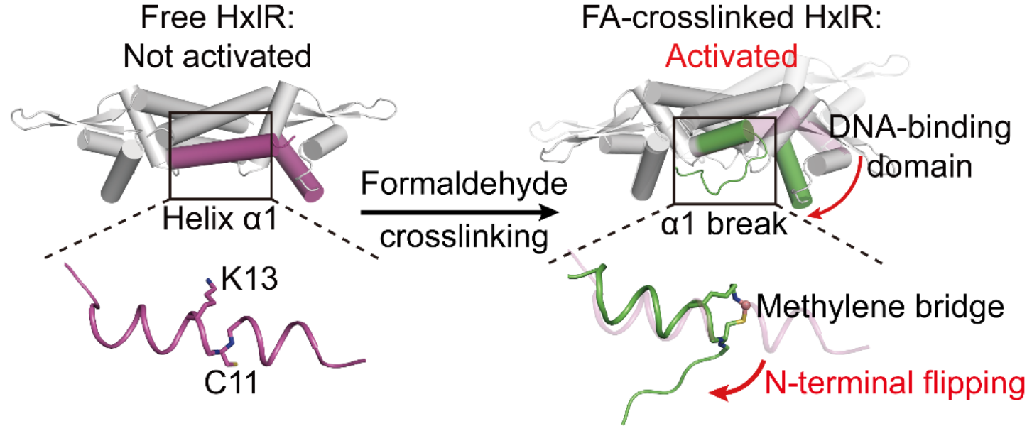 那么甲醛诱导的分子内交联又是如何实现对HxlR蛋白功能的激活?研究团队接下来仔细分析了不同处理条件与突变体的HxlR蛋白晶体结构。通过对甲醛处理前后的HxlR结构对比,他们发现看似简单的亚甲基桥却引起了蛋白整体构象的极大变化!甲醛诱导的Cys11-Lys13亚甲基桥迫使原本位于同一α螺旋两侧的两个氨基酸侧链相互靠近,扭曲了α螺旋结构,并“牵一发而动全身”,带动HxlR蛋白N端主链朝向翻转(N-terminal flipping),使得蛋白整体构象发生改变,极大地增强HxlR蛋白与DNA的结合能力,激活下游基因的转录。至此,研究团队揭示了HxlR特异性响应甲醛并发生结构与功能转换的分子机制。