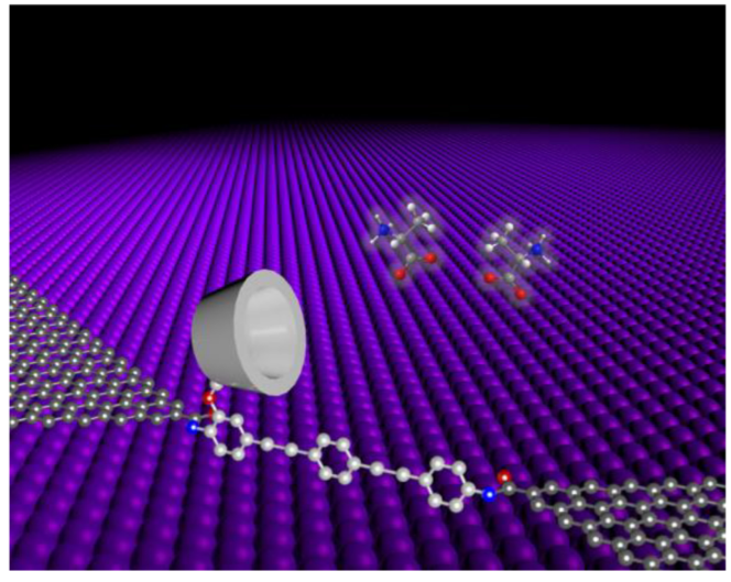 郭雪峰课题组和合作者设计合成了一种以全甲基化 β -环糊精为功能中心的共轭分子,并在末端修饰上氨基,通过酰胺键将其连接在带有羰基官能团的石墨烯点电极之间,构建了稳定的单分子器件。基于此类器件,通过高分辨的电学信号记录,实现了在单个事件水平上对氨基酸与环糊精分子的主客体动力学的原位实时检测,从而实现了对四种代表性氨基酸(丙氨酸、色氨酸、丝氨酸和酪氨酸)种类和存在形态的检测。氨基酸与环糊精的主客体结合过程是二级反应,而解离反应是一级反应。氨基酸在水溶液中存在内盐、共轭酸和共轭碱三种形态。这三种形态均可以与环糊精发生主客体识别,细致的动力学态间分析及理论计算可对复杂导电态进行辨认。基于氨基酸分子的解离弛豫时间及其对分子桥导电变化率两种参数,绘制了氨基酸手性识别的“指纹图谱”,实现氨基酸结构、种类和对映体的快速精准鉴定。