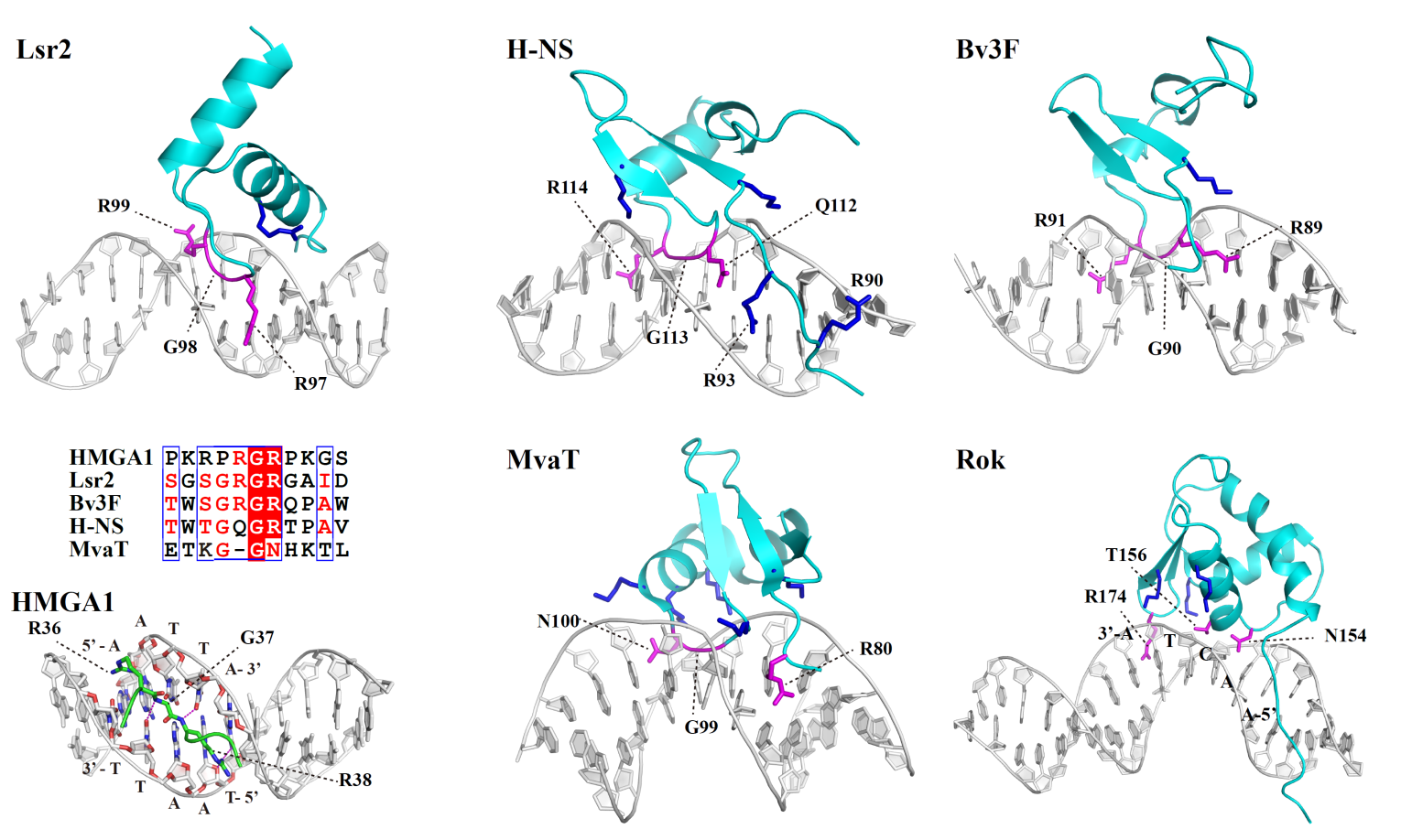 过去十余年来,夏斌教授课题组与加拿大多伦多大学的Jun Liu教授和William Wiley Navarre教授,以及美国哈佛大学的Simon Dove教授等课题组合作,系统地阐明目前已知的细菌外源基因沉默因子Lsr2H-NSBv3FMvaTRok等的三维空间结构和选择性识别DNA的分子机制。相关研究工作发表在Proc Natl Acad Sci U S A (2010, 107: 5154-9; 2011, 108: 10690-5)Curr Opin Microbiol (2012, 15: 175-81)PLoS Pathog (2015, 11: e1004967)、及Nucleic Acids Res (2018, 46: 10514-29)等学术杂志上。近期,课题组在Molecular Biology and Evolution杂志上发表综述文章“Xenogeneic Silencing and Bacterial Genome Evolution: Mechanisms for DNA Recognition Imply Multifaceted Roles of Xenogeneic Silencers”,前期工作进行了全面总结,深入比较分析了不同外源基因沉默因子DNA结合特性,并对相应的结构特征和分子机制进行了详细阐述(图2