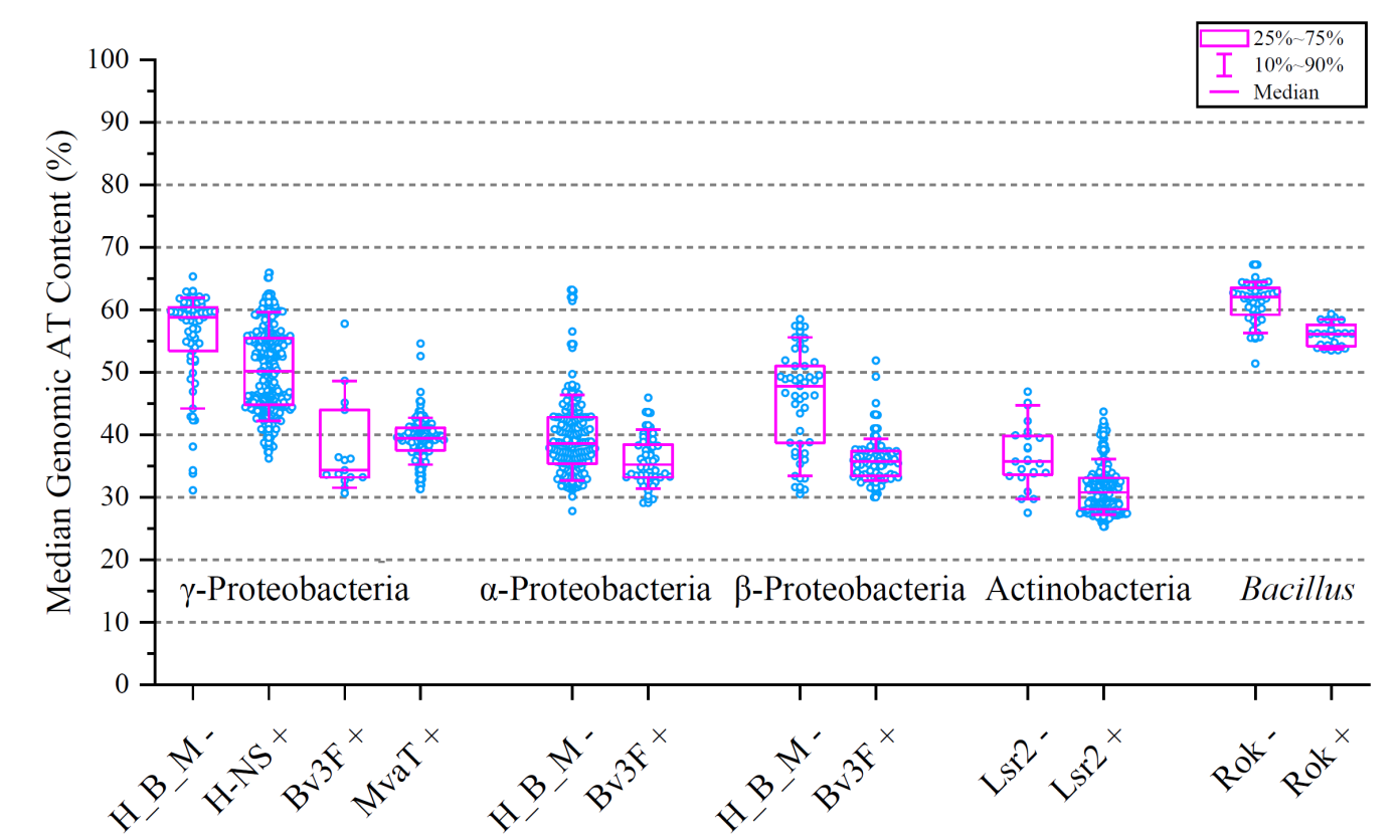 3. 外源基因沉默因子H-NSBv3FMvaTLsr2Rok所在细菌的基因组AT碱基含量分布比较