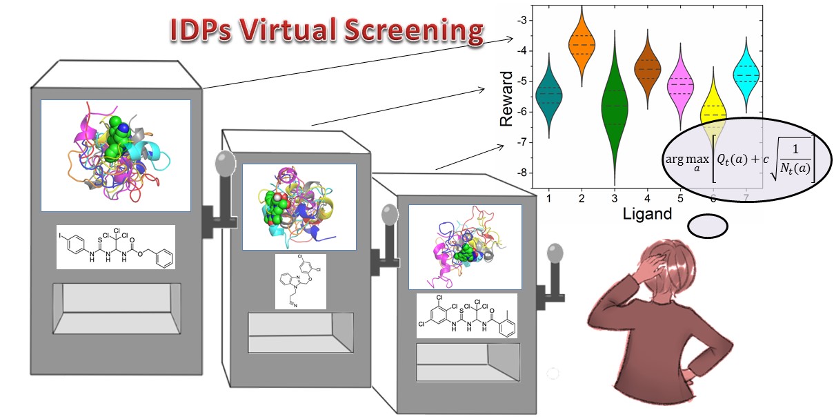 图2. 多臂老虎机的强化学习算法可以应用于无序蛋白的配体虚拟筛选。