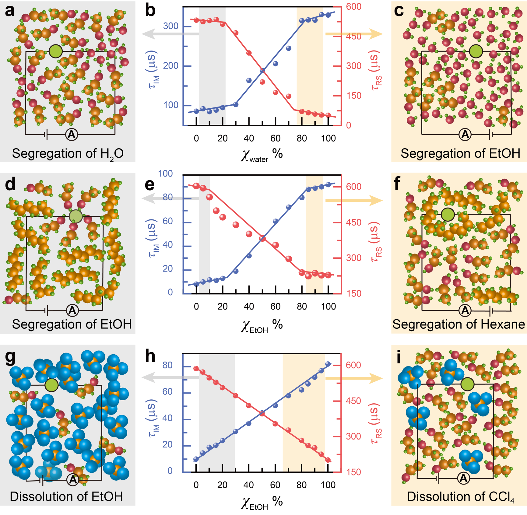 北京大学化学与分子工程学院郭雪峰课题组长期致力于单分子反应动力学机理的研究,与合作者一起揭示被系综平均掩盖的新机理和新现象,展示了基于单分子器件的平台在单分子反应动力学和单分子生物物理等基础研究方面的广阔应用前景。在前期工作中,他们将芴酮功能中心的分子桥通过酰胺键连接于石墨烯点电极之间,以芴酮与羟胺的亲核加成模型反应(Sci. Adv. 2018, 4, eaar2177)作为检测外部溶液环境细微变化的指标。通过逆向思维,利用高时间分辨率的电学监测平台,反过来在单分子水平上免标记精确检测溶剂的同质性与异质性。通过对该模型反应的热力学和动力学表征,证明了醇-水和醇-正己烷溶液的微观异质性以及醇-四氯化碳溶液的近理想混合(图2)。此外,他们还开发了单分子事件谱,实时监测溶剂对单分子溶剂化的事件,并以此来研究溶液中微观分离相的动态特性和溶剂中的分子间相互作用。这种具有单分子和单事件精度的独特高分辨率指示器的研发为深入解读溶剂效应和优化溶液中的化学反应和生物过程提供了无限的机会。