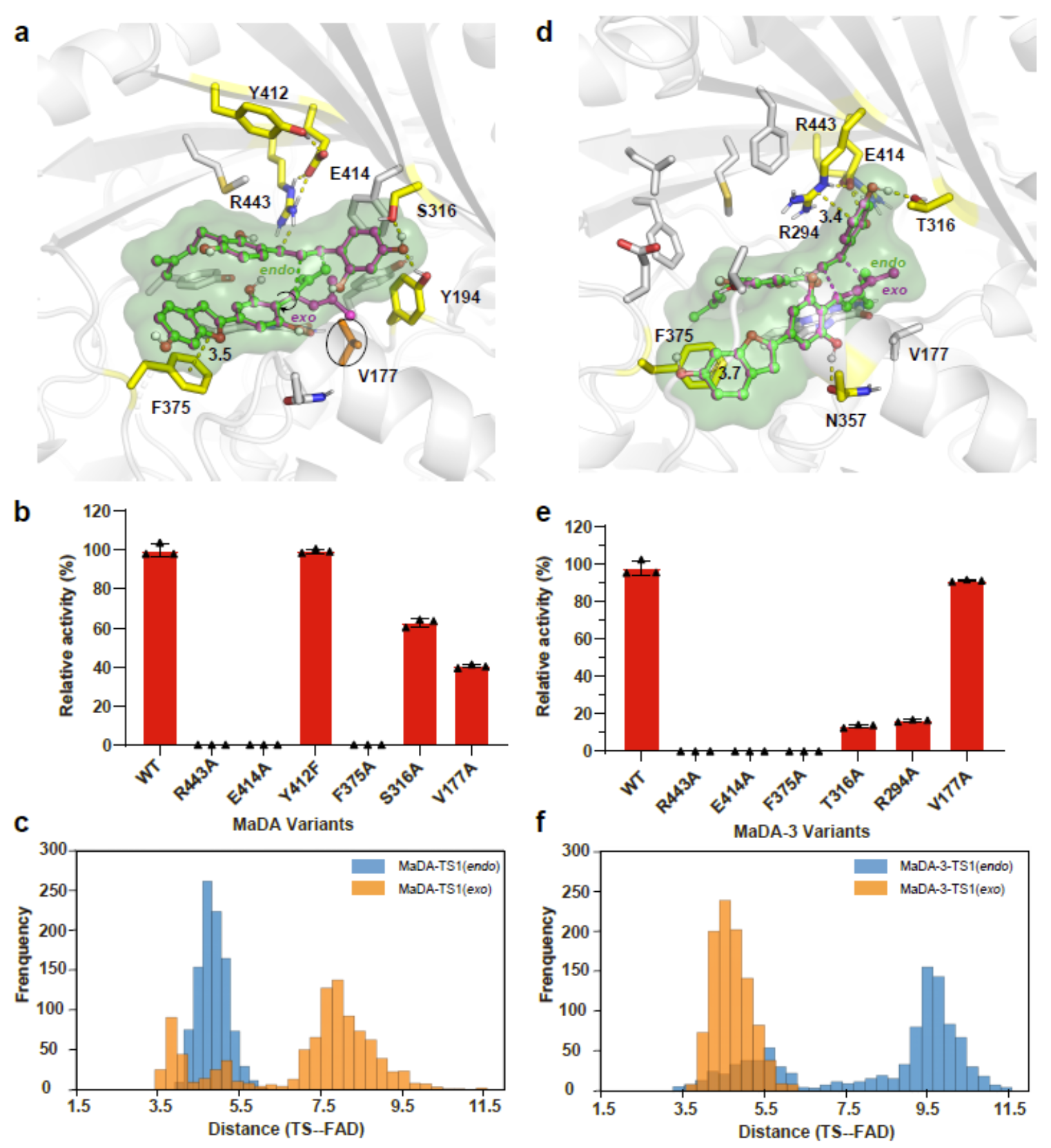 作者还成功解析了exo选择性D-A反应酶MaDA-3的晶体结构,并结合计算模拟以及突变实验解析了这两类D-A反应酶具有不同endo/exo选择性的机制。作者发现endo选择性D-A反应酶MaDA可以稳定结合endo过渡态而不能稳定结合exo过渡态(图2c);而exo选择性D-A反应酶可以稳定结合exo过渡态而不能结合endo过渡态(图2f)。当endo过渡态与MaDA结合时,R443可以与亲二烯体形成较强氢键相互作用,从而促进了反应的发生(图2a);而在MaDA-3中R294可以与亲二烯体形成较强的cation-相互作用,从而促进了反应的发生(图2d)。
