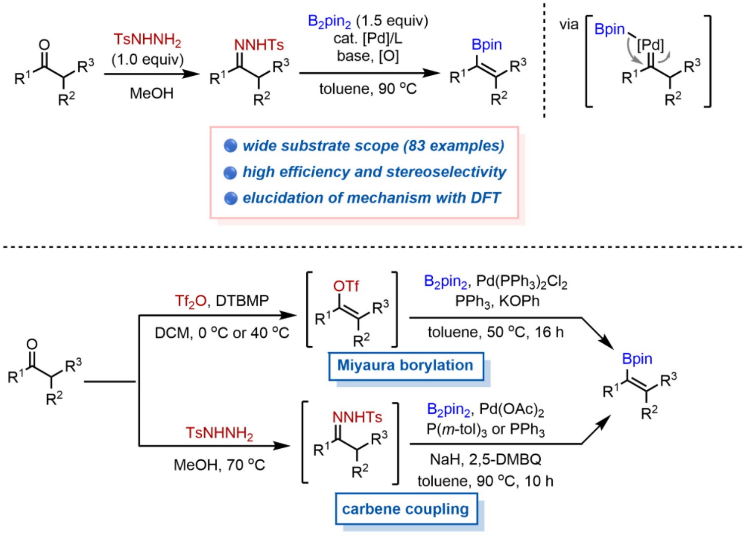 基于金属卡宾的催化反应,特别是交叉偶联反应近年来发展迅速,北京大学化学与分子工程学院王剑波课题组在相关领域开展了一系列研究工作(Acc. Chem. Res. 2013, 46, 236; Chem. Rev. 2017, 117, 13810.)。这些偶联反应的关键步骤是卡宾的迁移插入,而拓展迁移基团是该领域进一步发展的核心。近期,他们实现了含硼基团的迁移,建立了基于卡宾偶联的硼化反应新方法。该反应应用钯催化剂,经过酮衍生的对甲苯磺酰腙与联硼试剂的氧化偶联合成烯基硼酯。烯基硼酯是一类重要的有机合成中间体,其高效、高选择性的合成具有十分重要的意义。和经典的酮经由烯基三氟甲磺酸酯在钯催化下和联硼试剂偶联(Miyaura硼化)的方法相比,卡宾偶联的新方法具有一定的优势或互补性(J. Am. Chem. Soc. 2021, 143, 9769.)。