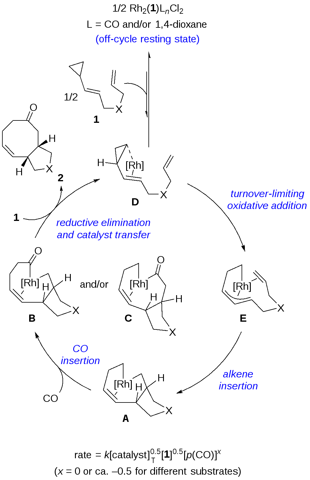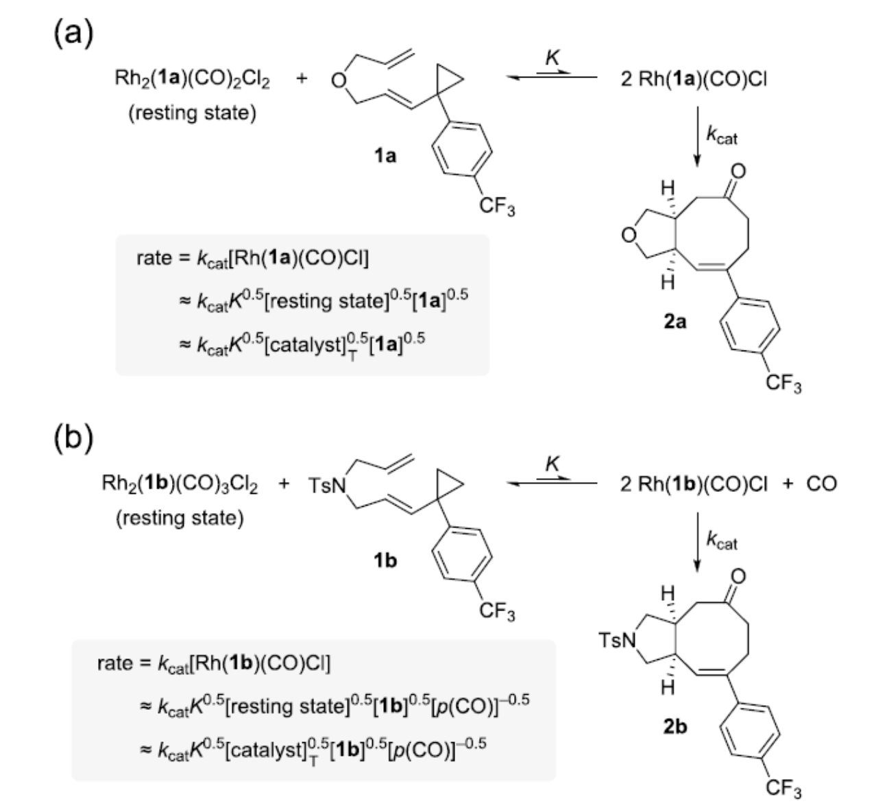 然而,余志祥课题组在研究该反应机理的过程中却遇到了许多困难。首先,对于像[5+2+1]环加成反应这一类过渡金属催化的多步反应,很难选择合适的计算方法来准确描述所有的基元步骤,如配体的配位与解离、氧化加成、迁移插入和还原消除。此外,识别真正的催化物种并了解其是如何产生的也是一项困难的任务。最近,余志祥课题组报道了[5+2+1]环加成反应的详细机理研究,对这个困扰他们十五年的机理问题有了深入的理解。作者首先借助视觉动力学分析探究了反应体系中真正的催化物种。他们发现[5+2+1]环加成反应对于催化剂[Rh(CO)2Cl]2和氧桥底物1a都是0.5级的,这表明双核休眠种和单核催化物种之间存在化学平衡并有底物参与其中(图2)。基于此,课题组研究人员提出反应的休眠种包含两个铑中心及一个底物分子,而催化物种包含一个铑中心和一个底物分子。此外,课题组研究成员还发现CO的级数是零,这表明休眠种中CO的个数是反应决速步过渡态中CO个数的两倍(后续的计算化学研究表明决速步过渡态中只含有一个CO配体)。对于氮桥底物1b,余志祥课题组发现催化剂和底物的级数仍然都是0.5,但是对于CO的级数是-0.5,研究者认为这是由于休眠种的组成发生了变化。催化物种形成的过程中需要从休眠种中解离出CO,这使得CO分压增大反而会对反应产生一定的抑制。