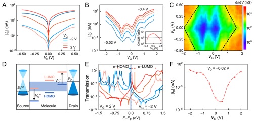 不同于传统场效应晶体管的工作原理,单分子场效应晶体管通过栅电压调控分子轨道来控制分子结中的电流。研究证明,基于离子液体栅的三端器件—卟啉单分子场效应晶体管—在室温下展现出了优异的场效应性能(图2):输出曲线和转移曲线均表现出了明显的栅响应性质,开关比可达4800,亚阈值摆幅约为179 mV/dec;从二维微分电导谱中发现卟啉单分子场效应晶体管具有稳定、可重复的双极调控性能,并且定量地得到每增大1 V的栅压,分子轨道移动约0.5 eV,展现出较强的栅调控能力;上述实验结论与理论计算结果吻合。