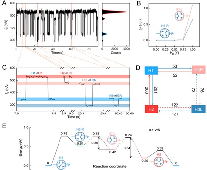 在100 K至140 K下,在分子结的伏安特性曲线的较高偏压位置,发现了四个独立电导态的裂分,进一步对分子结电流进行实时监测,发现了相互转化的四个电导态。由于分子结中分子的对称性,确定新增的两个电导态来自于下图4B中的两个对称结构。通过对四稳态时序的进一步分析,得到了其中的相互转化关系,结合理论计算给出了每一步反应相应的活化能。