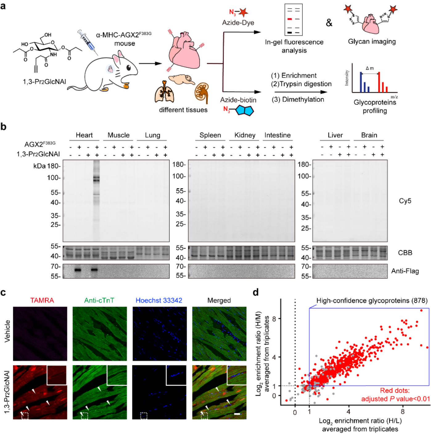 基于此,他们将该策略拓展到了转基因小鼠中。他们首先利用心肌细胞特异的启动子α-MHC实现了AGX2F383G在小鼠心肌细胞中的特异性表达,然后腹腔注射非天然糖1,3-Pr2GlcNAl,实现了非天然糖分子在小鼠心肌细胞中的特异性代谢。从各组织标记结果来看,GeMGL策略展现出严格的心肌细胞选择性。结合定量蛋白质组学方法,在小鼠心肌细胞中鉴定到582个O-GlcNAc修饰蛋白。分析发现,心肌细胞中许多糖酵解、TCA循环和氧化磷酸化途径相关蛋白都具有O-GlcNAc糖基化修饰,表明O-GlcNAc糖基化修饰可能在心肌细胞的线粒体能量代谢过程中发挥重要功能。