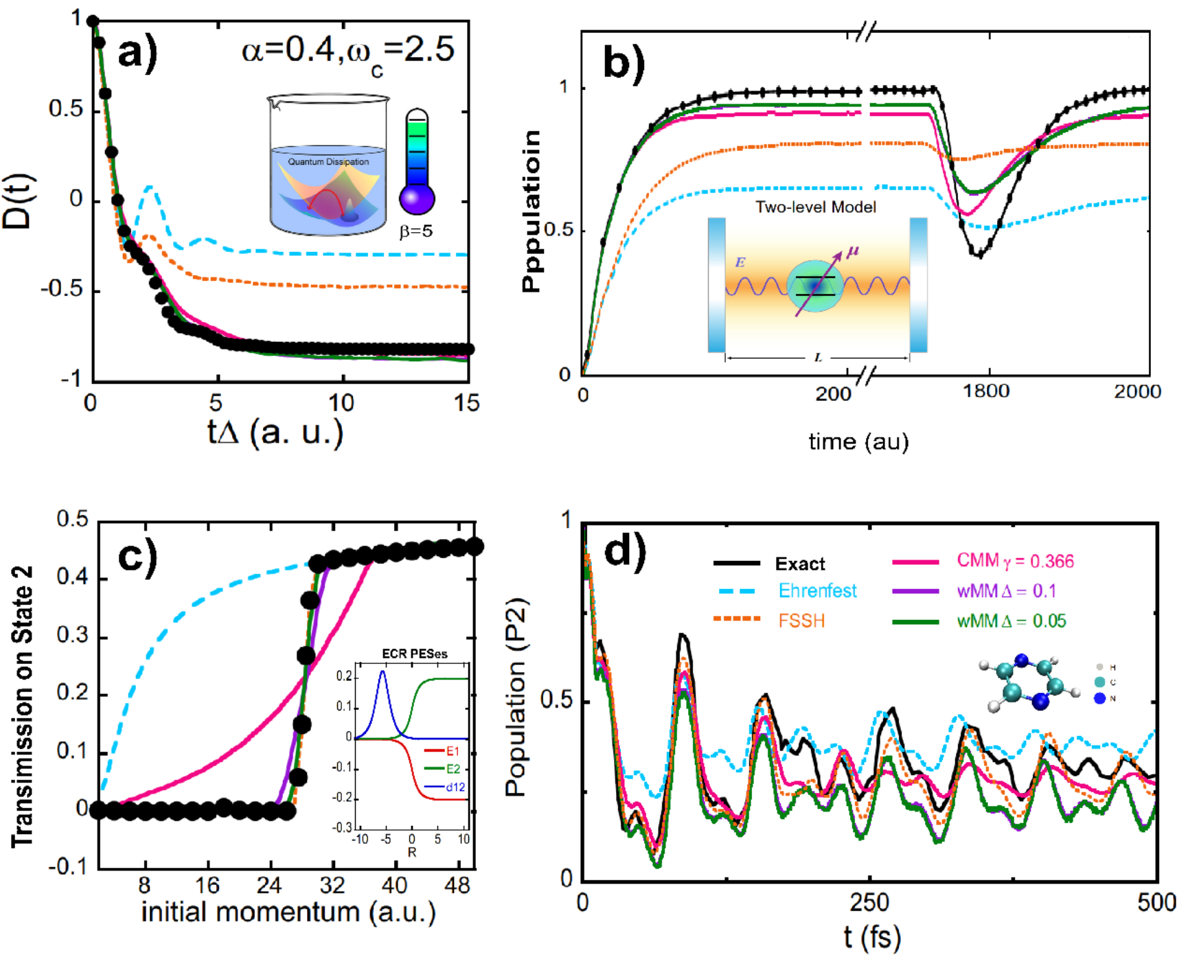 图4:原子核的Wigner相空间和电子态的wMM相空间相结合应用于一系列非绝热问题的计算。(a)(b)(c)(d)分别展示了自旋玻色模型、原子-光腔自发辐射模型、Tully的ECR模型以及吡嗪锥形交叉模型的计算结果。