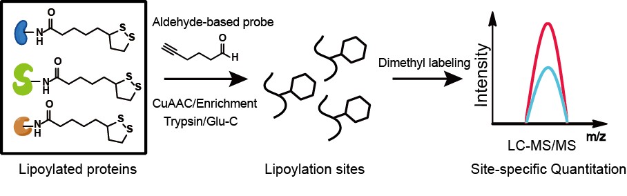 最后,作者进一步将该定量化学蛋白质组学流程运用到哺乳细胞体系中。利用新型的电离辅助亲和标签CY58,结合二甲基化标记定量策略,作者成功地实现了对人源细胞中所有已知的六个硫辛酰化修饰位点进行定量,有望对不同类型生物样本中的硫辛酰化修饰水平进行测定。