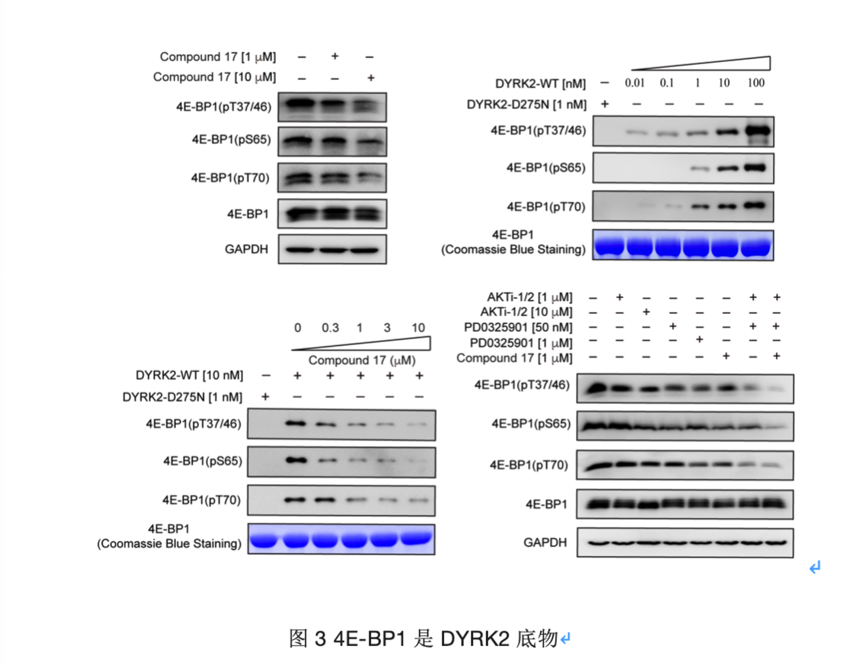 4E-BP1是转录过程的重要调节因子,已有研究表明是DYRK2的潜在底物。该研究通过建立体外激酶活性体系,验证了DYRK2可以直接磷酸化4E-BP1上的多个位点(包括质谱鉴定到的位点Thr37),并且C17以剂量依赖性的方式抑制这些位点。此外,4E-BP1受多种激酶的共同调节,进一步研究表明,当C17与AKT、MEK抑制剂联用时,可以更高效地抑制蛋白磷酸化水平,表现出不同抑制剂之间的协同效应。总之,通过大量的体内外实验验证,结果表明4EBP1是DYRK2的直接底物,并揭示了DYRK2 抑制剂与其他激酶抑制剂联合用于癌症治疗的潜在用途。