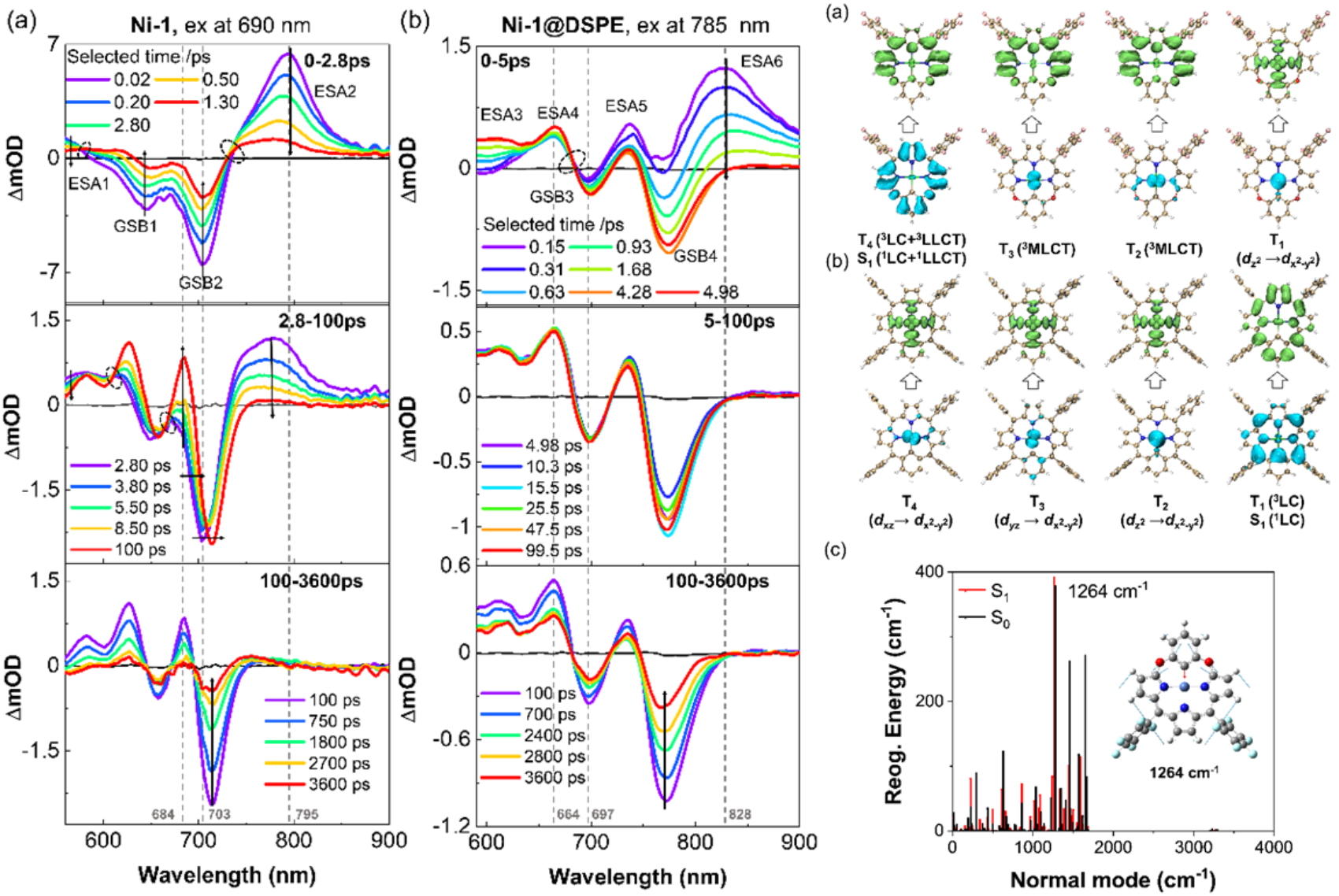瞬态吸收光谱结合理论计算表明, NiII离子由于d电子配位场分裂能较小,低能三重态既有金属到配体的电荷转移(MLCT)过程,存在以金属中心的d-d跃迁过程,系间窜越反而比较强。由于d-d跃迁激发态的存在,只在低温下表现出磷光发射。Ni-C键的激发态伸缩振动成为激发态弛豫重要的非辐射跃迁通道,因此即使在单体和聚集体中,分子的光热转化效率都比较高(图2)。