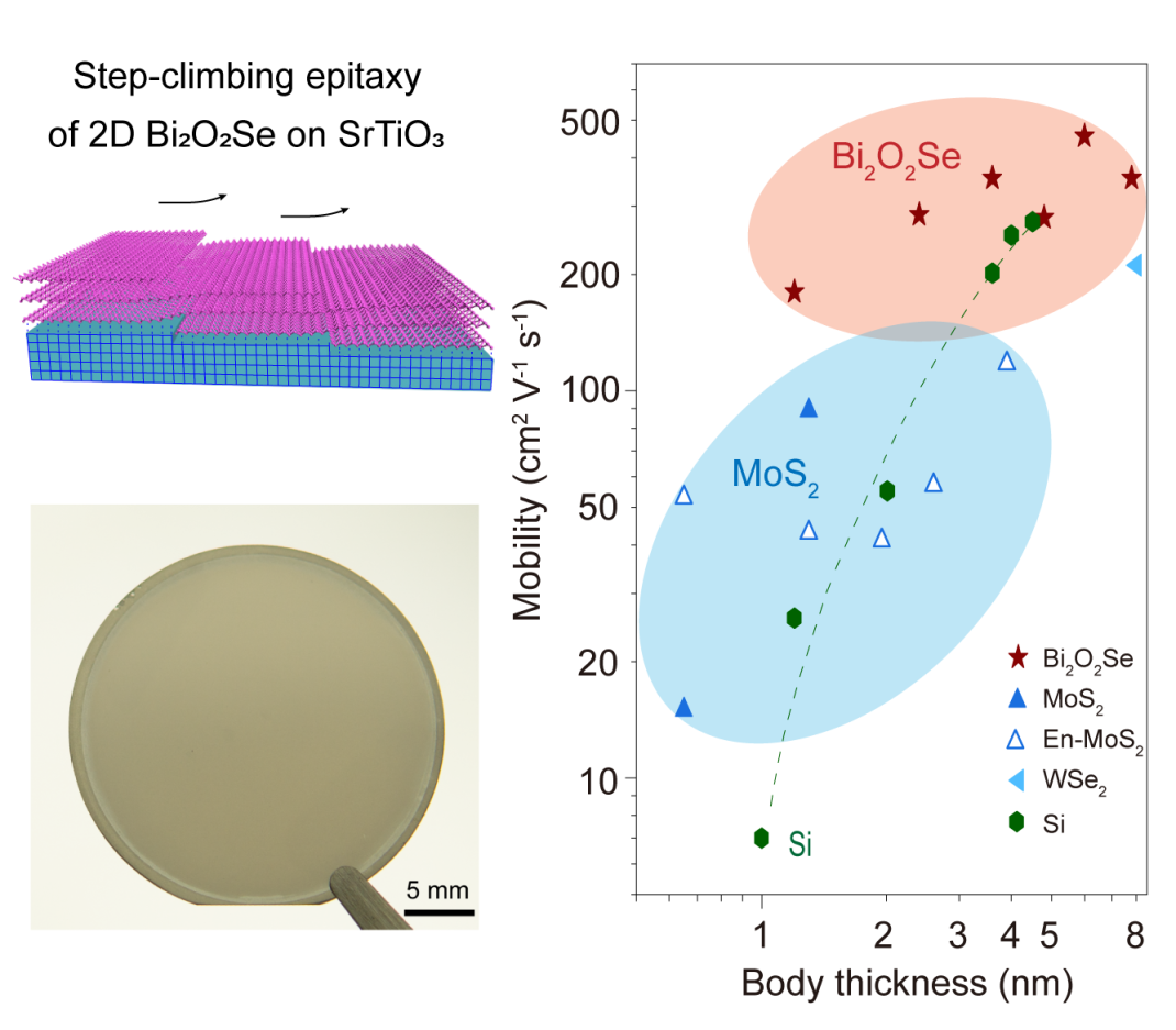 图1: 晶圆级超薄二维Bi2O2Se半导体单晶薄膜跨台阶外延生长及其超高电子迁移率